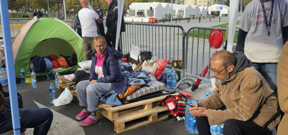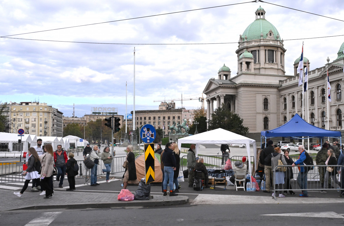 Na uglu Takovske ulice i Bulevara kralja Aleksandra je improvizan krevet na kojem leži Dijana Hrka, čiji je sin stradao u padu nadstrešnice na Železničkoj stanici u Novom Sadu, a okupljena je i manja grupa građana koji joj pružaju podršku. Hrka je juče stupila u štrajk glađu.