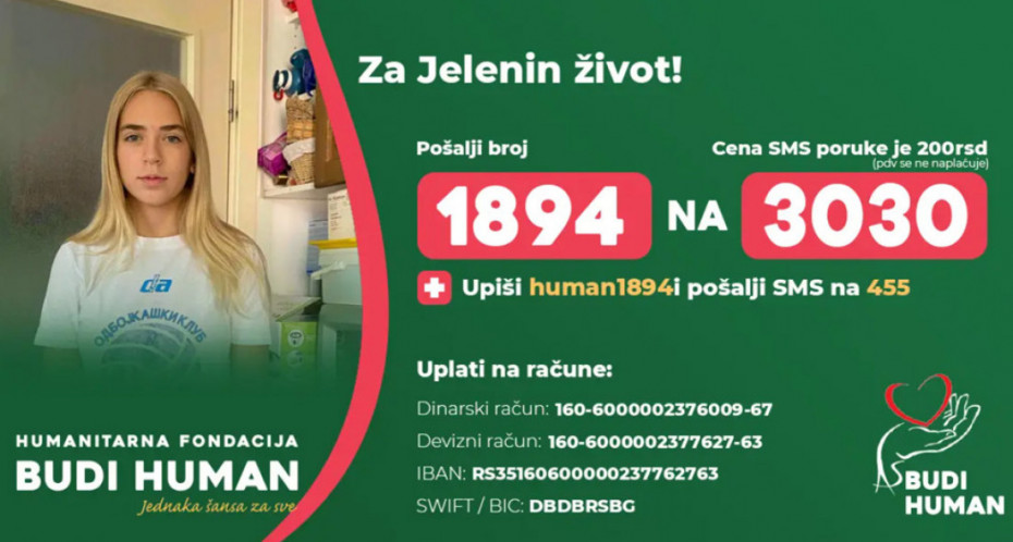 Da bi Jelena što pre započela lečenje u inostranstvu, neophodna je finansijska pomoć za specijalističke preglede, laboratorijske analize, terapije, putne troškove i smeštaj tokom lečenja. Fondacija poziva sve koji su u mogućnosti da doniraju i pomognu u prikupljanju sredstava.
