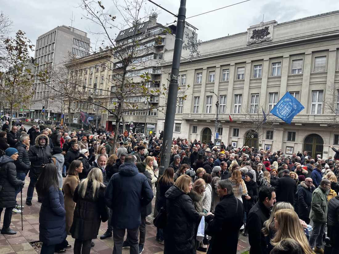 Sudije i tužioce podržavajui građani i studenti, a okupljeni nose zastave fakulteta i zborova i duvaju u pištaljke i vuvuzele.