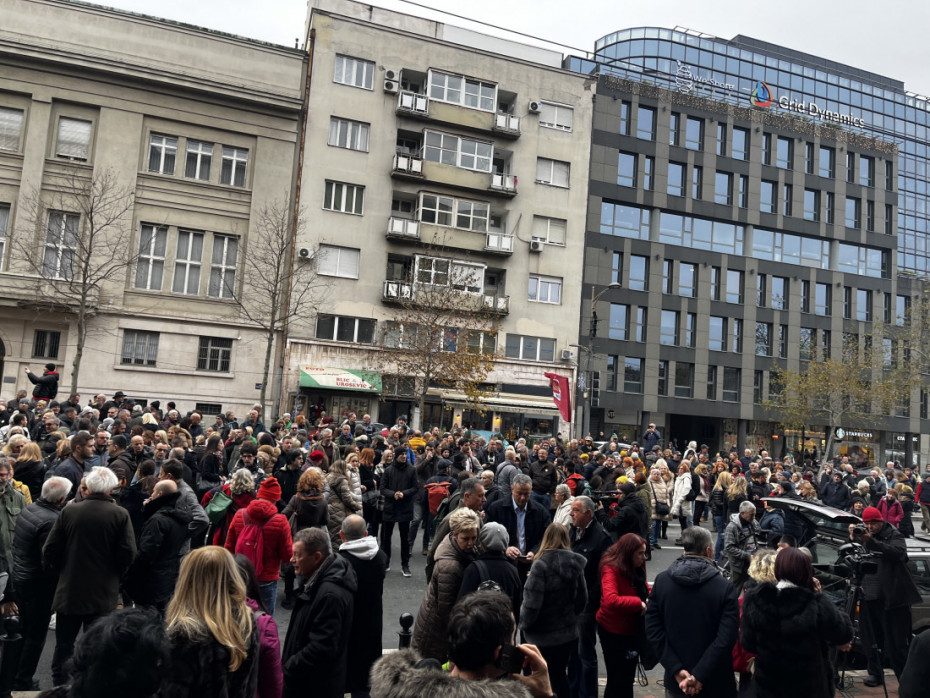 Kako su ranije najavili, protest se pre svega svega održava zbog toga što tužiteljki iz Prvog osnovnog javnog tužilaštva u Beogradu nije bili dozvoljeno da izvrši uviđaj posle incidenta u šatorskom naselju ispred Skupštine.