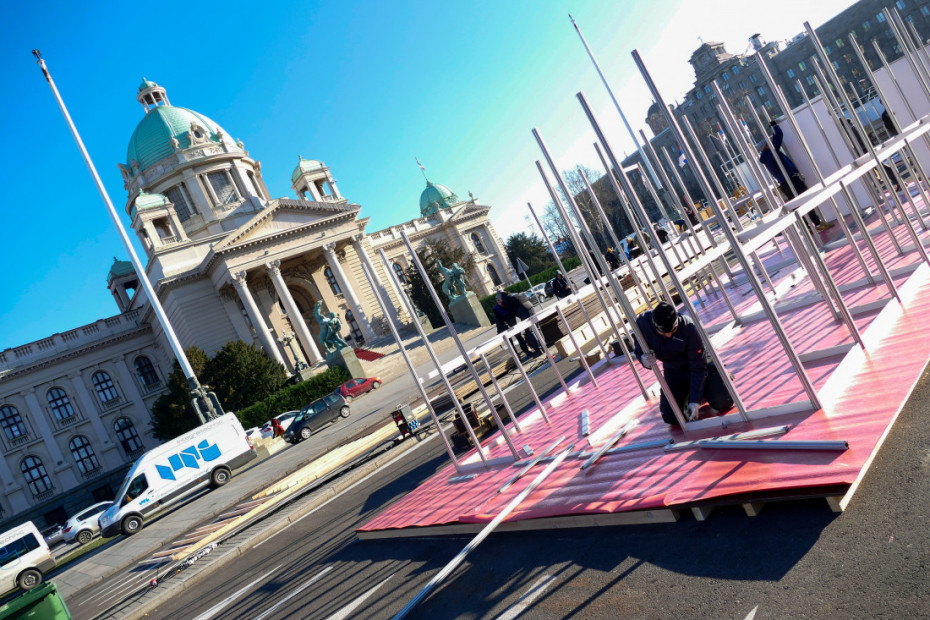 Šatori ispred Narodne skupštine, u kojima su od marta bili građani i studenti koji se protive blokadama fakulteta, saobraćajnica i institucija, uklonjeni su, a na tom mestu se postavljaju montažni objekti za Božićno selo, koje će narednih dana biti otvoreno za sve građane.