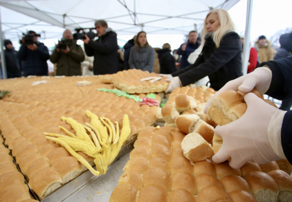 Prisustnima ispred Hrama Svetog Save Unija pekara Srbije podelila je i 4.000 krstića i više od 2.000 hiljade paketića, kao i druge poklone.
