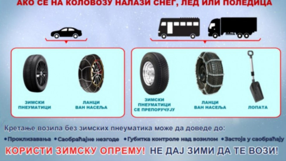 JP "Putevi Srbije" apeluje na vozače da, zbog vlažnih kolovoza i pojave niskih temperatura, moguće poledice i slabe vidljivosti na pojedinim deonicama, bez preke potrebe ne kreću na put, a ukoliko krenu da obavezno imaju zimsku opremu i lance u brdovitim i planinskim terenima. Apeluje na sve učesnike u saobraćaju da prilagode vožnju uslovima na putu, kao i da ne pretiču vozila zimskog održavanja, jer svojim neodgovornim ponašanjem mogu da prouzrokuju saobraćajnu nezgodu.