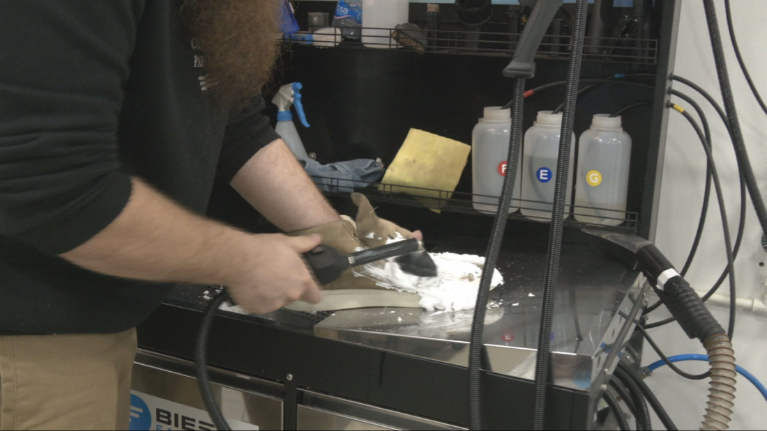 "Trudimo se da vratimo sjaj, da vratimo postojeću boju, pre svega. Ne farbamo obuću, ali naša mašina koja detaljno čisti obuću vraća sjaj i prvobitnu boju čizama", kazala je Milena Živkov, vlasnica hemijskog čišćenja.