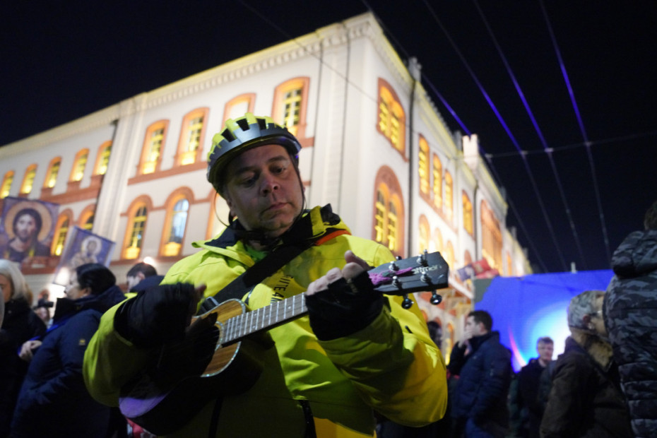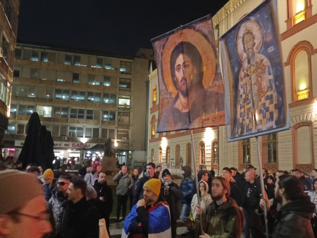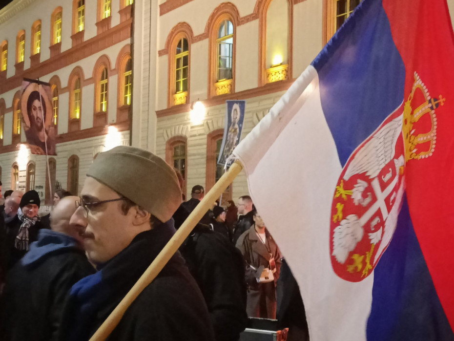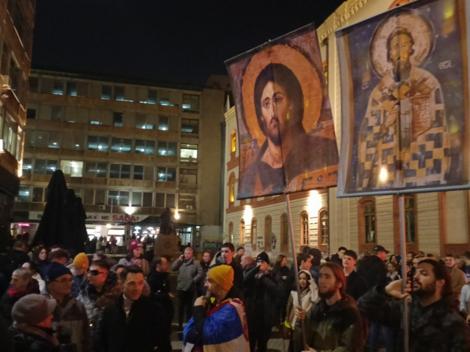 Okupljeni nose zastave Srbije i pojedinih fakulteta, kao i reprodukcije ikona Svetog Save.