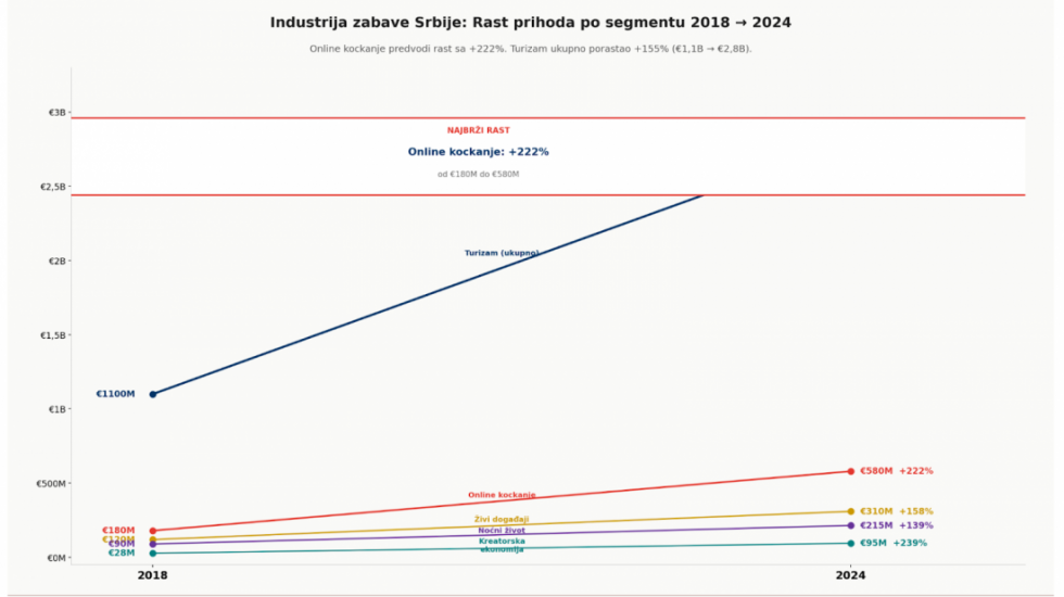 Ali ono što je zaista zanimljivo nije ukupna cifra — nego od čega taj novac dolazi. Festivali, noćni život, kulturne manifestacije, i industrija digitalnih igara koja je za šest godina porasla 222%. Sve to zajedno čini kombinaciju koja se teško planira i još teže kopira.