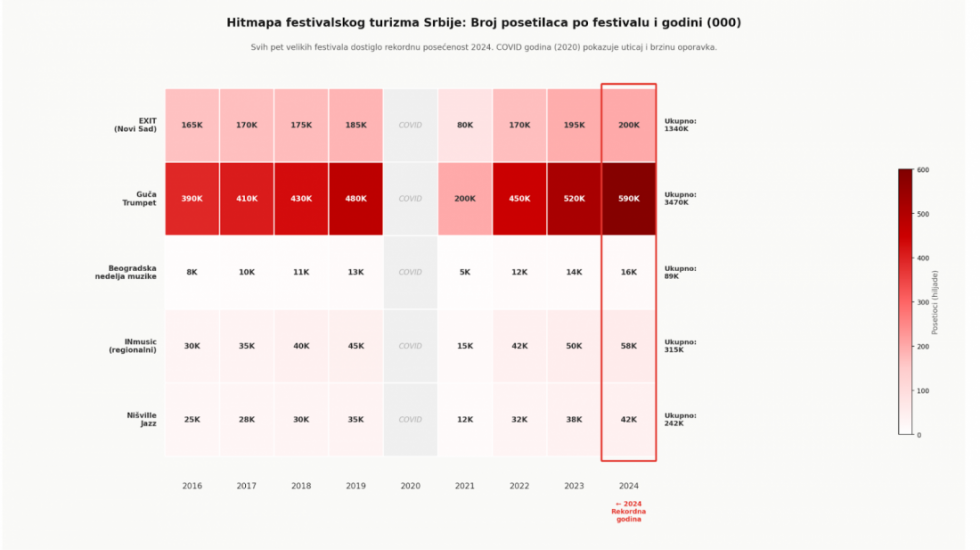 EXIT festival pratio je isti obrazac. Počeo 2000. kao studentski protest na Novosadskoj tvrđavi. Do 2024. redovno se pojavljuje na listama top 10 evropskih festivala prema Mixmag-u i Resident Advisoru. 200.000 posetilaca po izdanju. Procenjeni ekonomski efekat na vojvođansku privredu: oko 35 miliona evra godišnje.