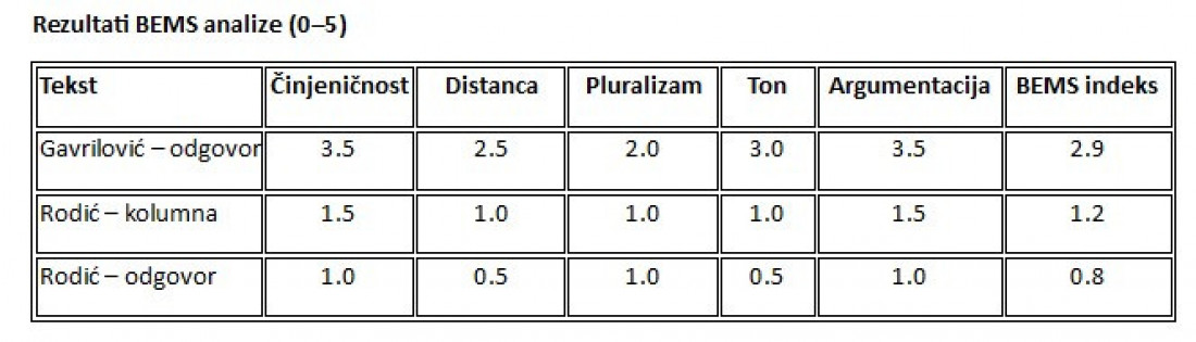 - Tekst Zorana Gavrilovića predstavlja polemiku sa metodološkim objašnjenjem, u kojoj se objašnjava šta je BEMS, koje su njegove dimenzije i kako se primenjuje. Iako je tekst polemičan, dominantno je usmeren na metodologiju i predmet rasprave.