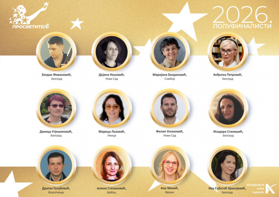 Renomirani žiri nastavničke nagrade Prosvetitelj za 2026. godinu od preko 200 nominovanih kandidata u prvom krugu izabrao je 26 kandidata, od kojih se 12 najboljih plasiralo u polufinale. Kandidati dolaze iz različitih sredina, različitih disciplina, rade u različitim uslovima i ustanovama, formalnom i neformalnom obrazovanju, sa decom različitih uzrasta i interesovanja. Ono što im je zajedničko jeste da su izuzetni stručnjaci, da njihov rad ostavlja dobar trag na živote dece i mladih, ali i na profesionalnu i širu zajednicu.