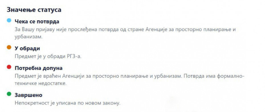 Pristupom linku na stranici RGZ-a građani mogu proveriti da li je njihova nepokretnost upisana. Kada pristupite linku, moguća su četiri statusa vaše prijave, a to su