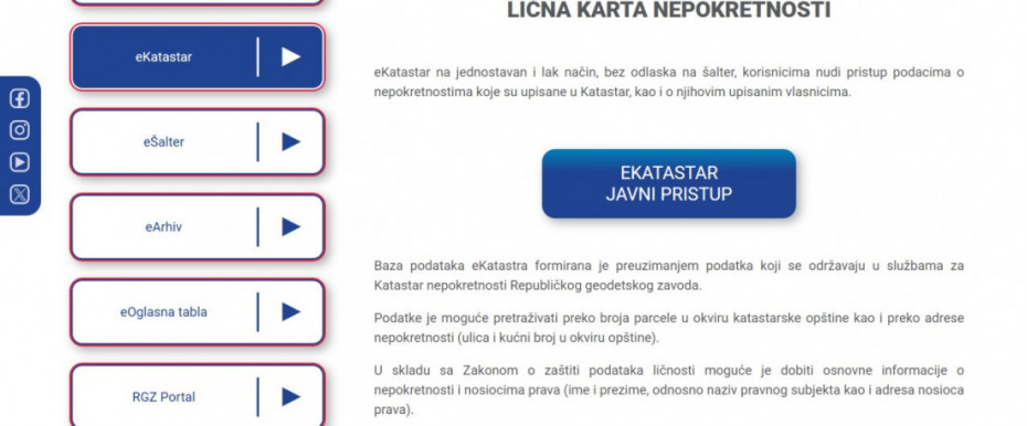 Ukoliko za vašu prijavu stoji status "završeno“, možete ući na eKatastar i dodatno proveriti da li je nepokretnost upisana. Kada otvorite sajt, kliknite na opciju eKatastar - javni pristup.