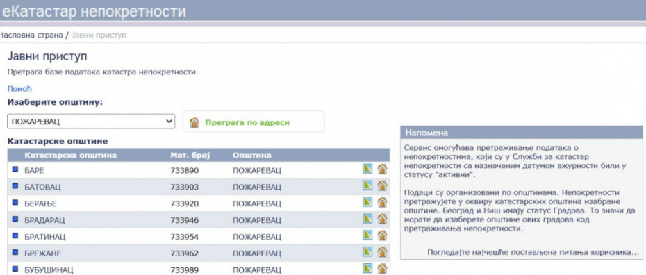 Nakon toga otvoriće se novi prozor za pretragu. U prvom koraku izaberite opštinu - u ovom primeru izabrali smo Požarevac.