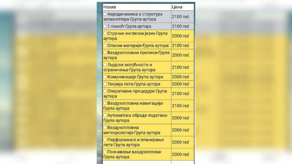 Roditelji moraju da kupe: Stručni engleski jezik, Opasne materije, Vazduhoplovni propisi, Ljudske mogućnosti i ograničenja, Komunikacije, Teorija leta, Operativne procedure, Vazduhoplovna navigacija, Automatska obrada podataka, Vazduhoplovna meteorologija, Performanse i planiranja leta i Poznavanje vazduhoplova. Svaka knjiga košta 2.000 do 2.100 dinara. To znači da roditelji moraju da plate odmah 24.000 dinara.