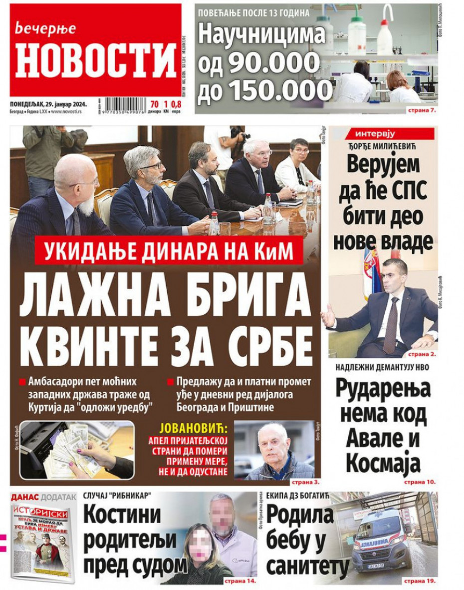 Naslovne strane dnevne štampe za ponedeljak, 29. januar