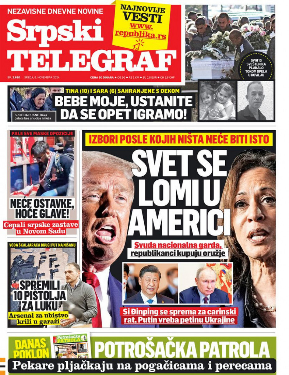 Naslovne strane dnevne štampe za sredu, 6. novembar