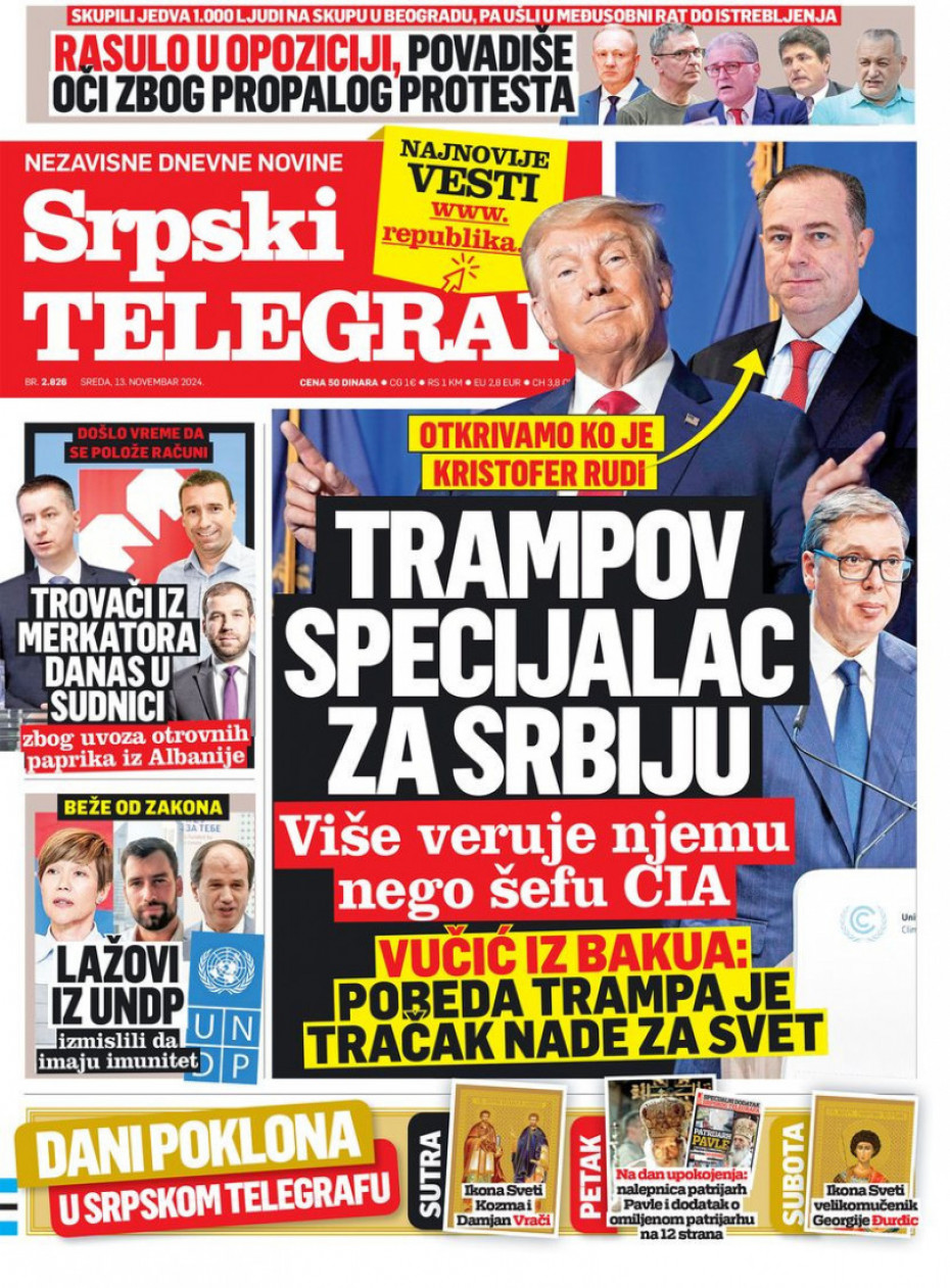 Naslovne strane dnevne štampe za sredu, 13. novembar