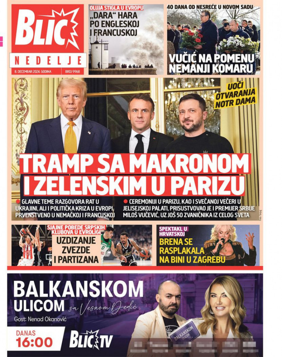 Naslovne strane dnevne štampe za nedelju, 8. decembar