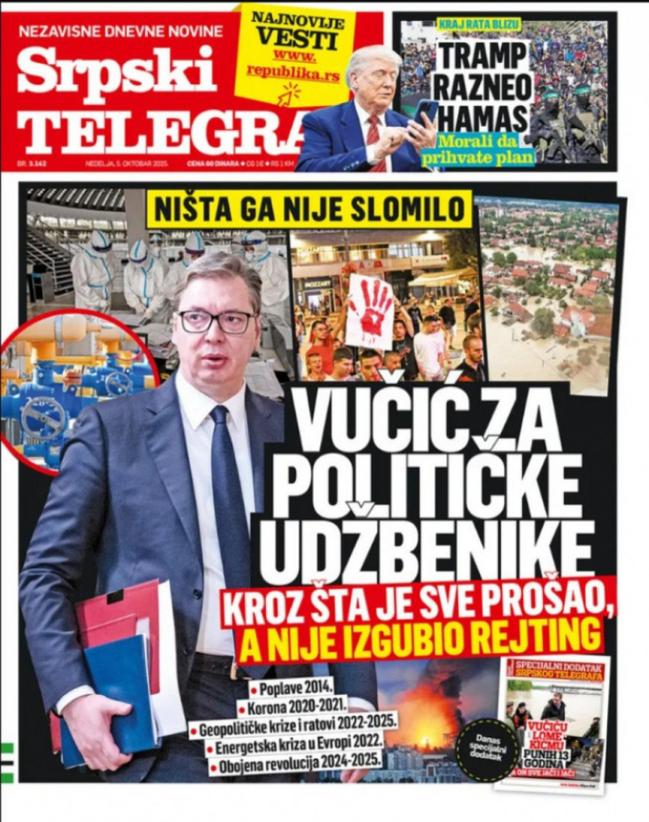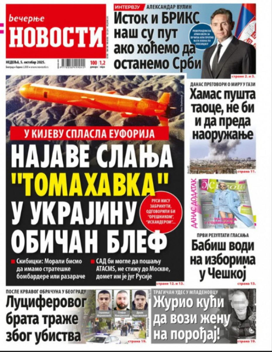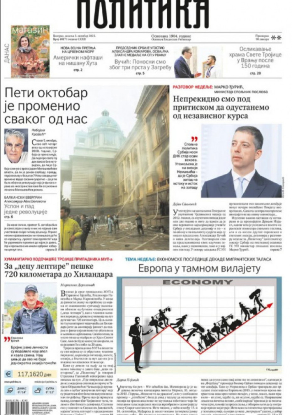 Naslovne strane dnevne štampe za nedelju, 5. oktobar