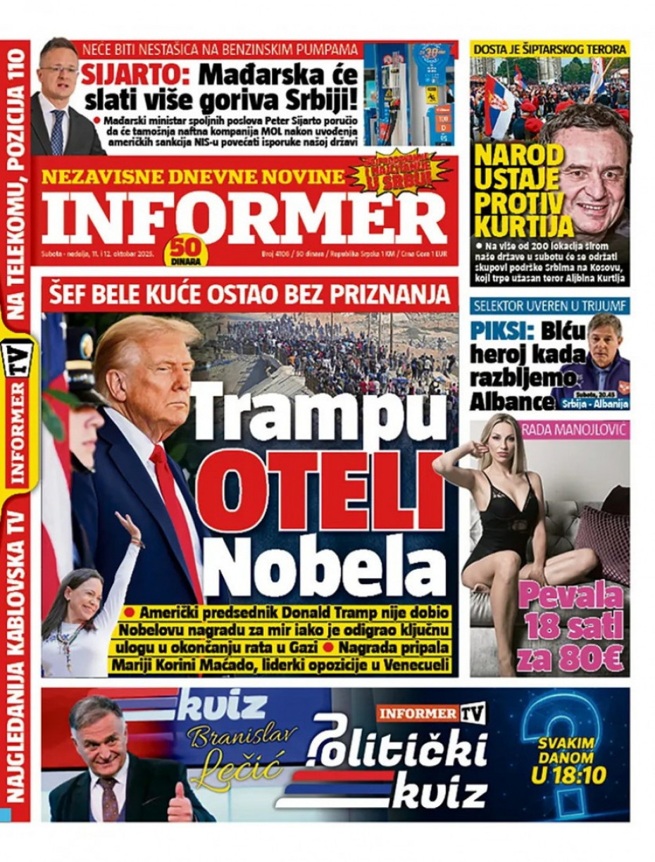 Politika Naslovne strane dnevne štampe za subotu, 11. oktobar Pogledajte šta na naslovnim stranama donose dnevne novine u Srbiji u izdanju za subotu, 11. oktobar 10/10/2025 20:43 https://www.euronews.rs/srbija/politika/191422/naslovne-strane-dnevne-stampe-za-subotu-11-oktobar/vest pročitaj celu vest