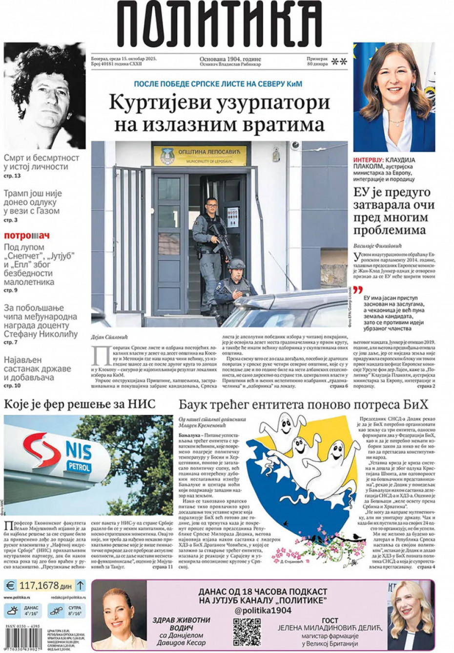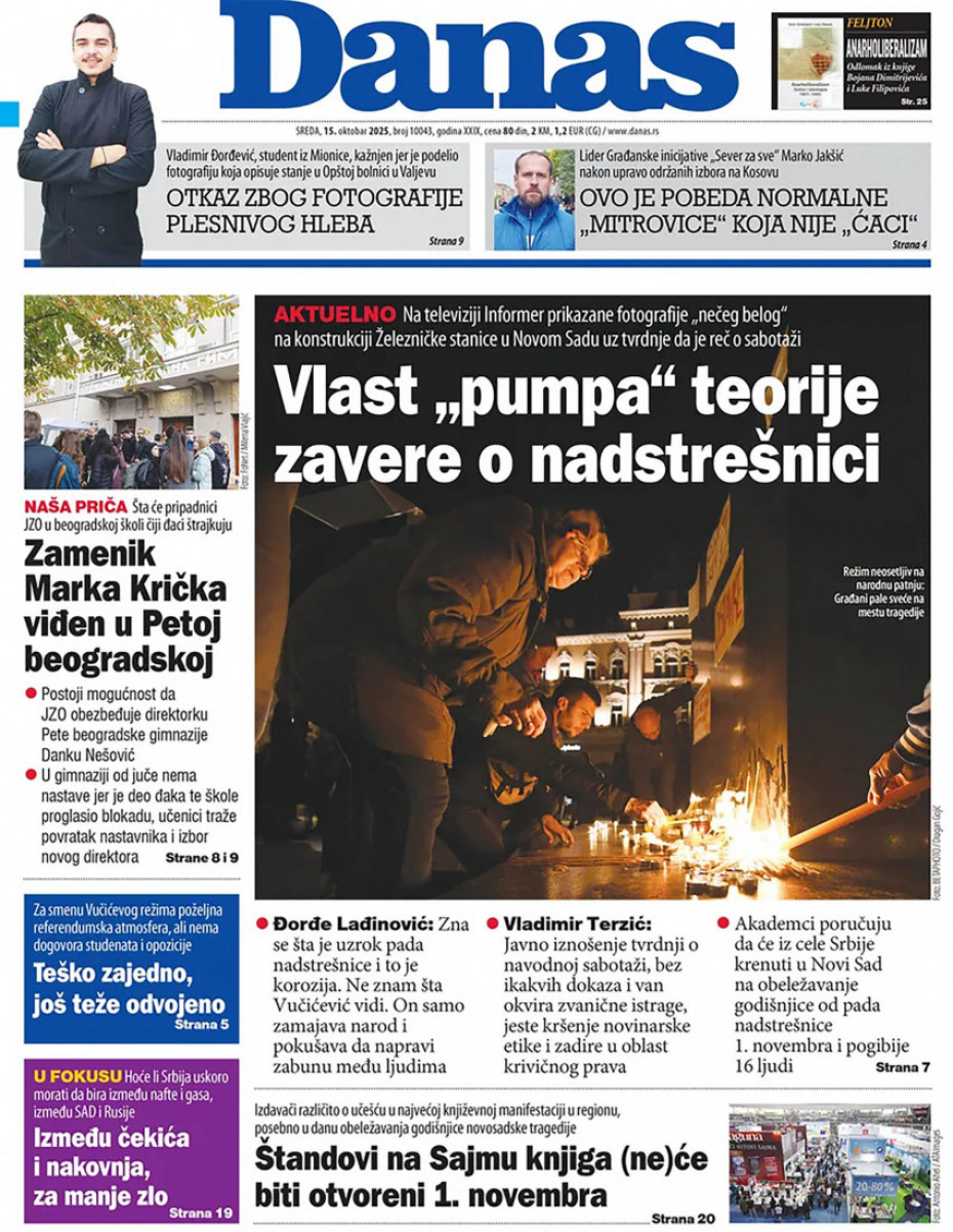 Naslovne strane dnevne štampe za sredu, 15. oktobar