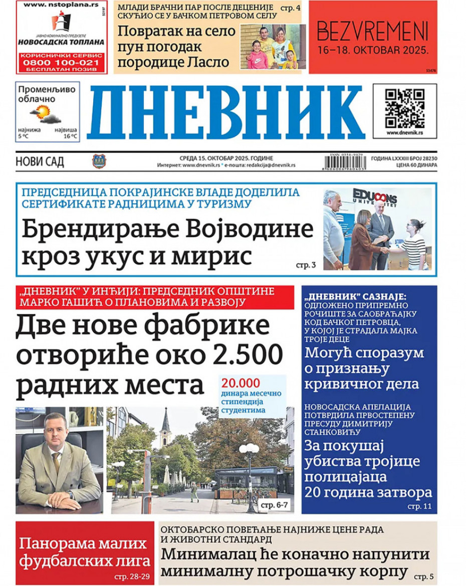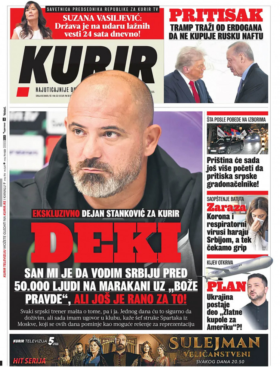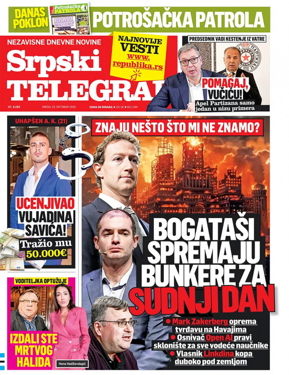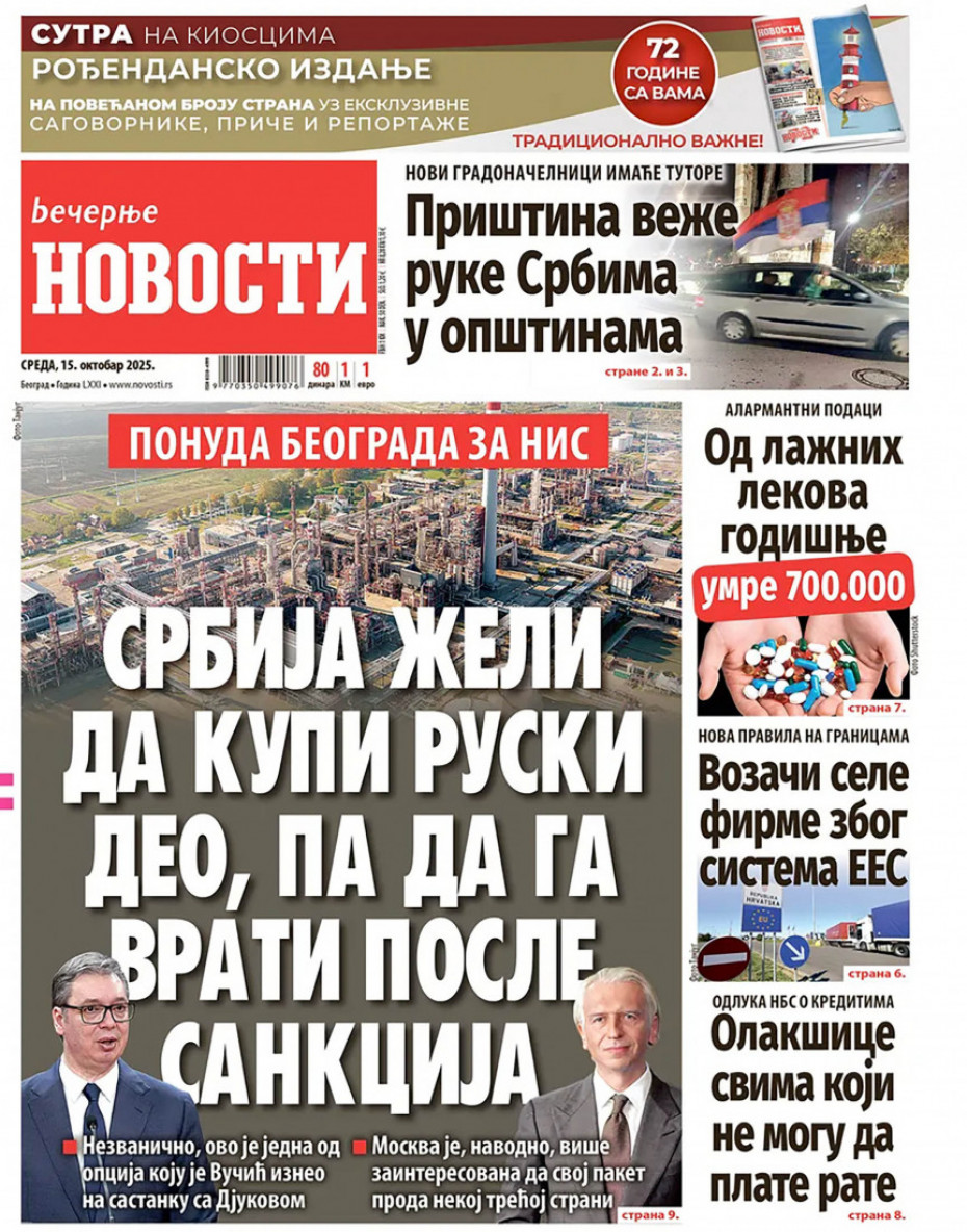 Pogledajte šta na naslovnim stranama donose dnevne novine u Srbiji u izdanju za sredu, 15. oktobar