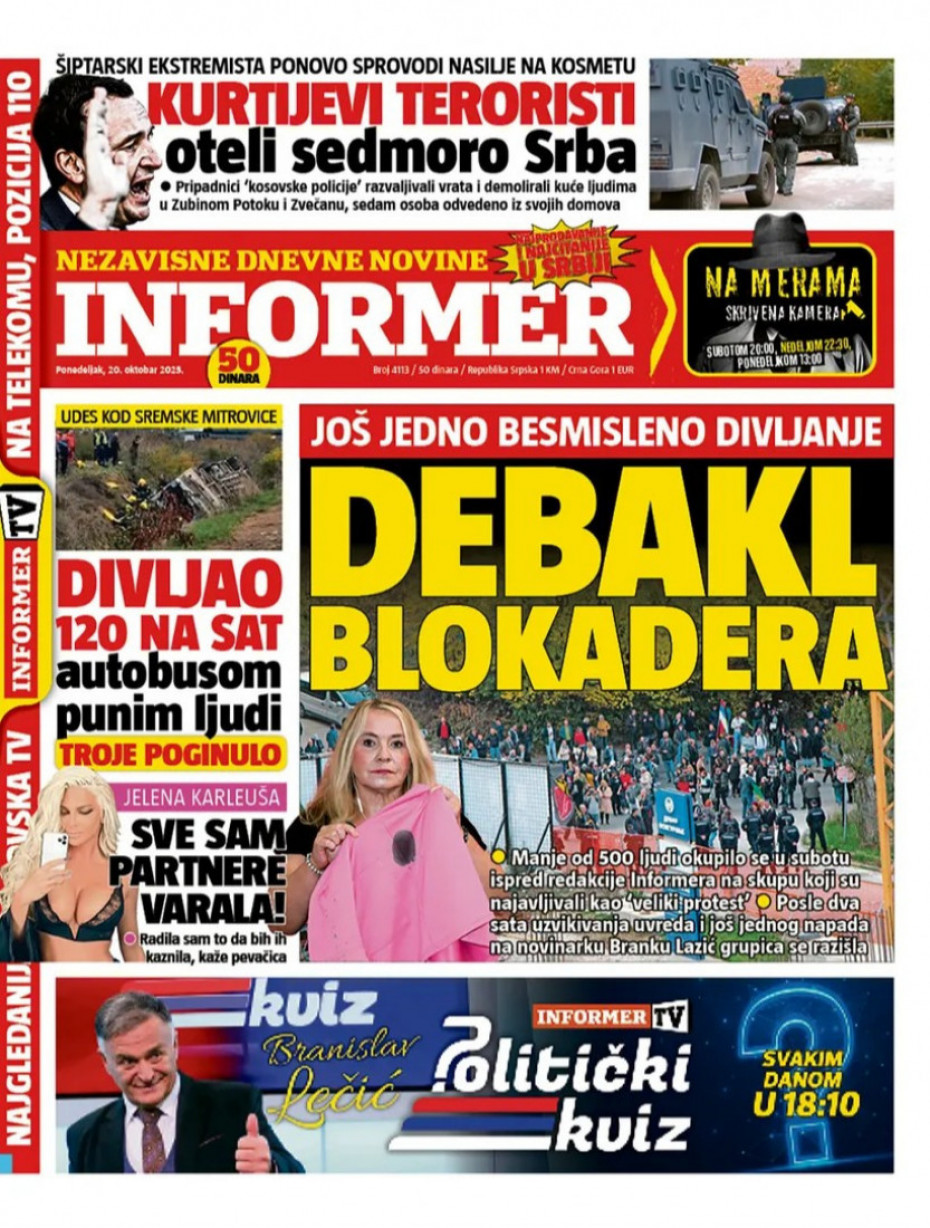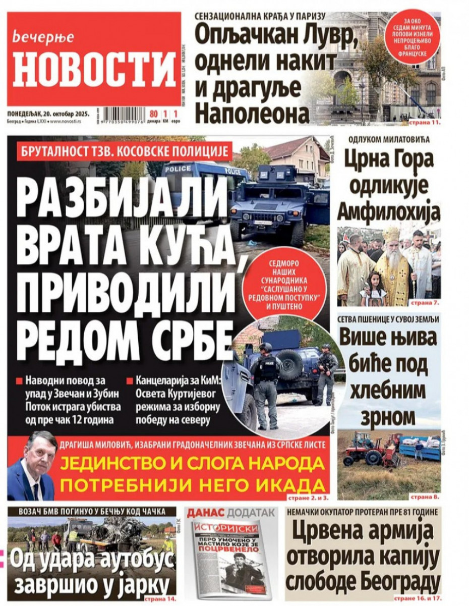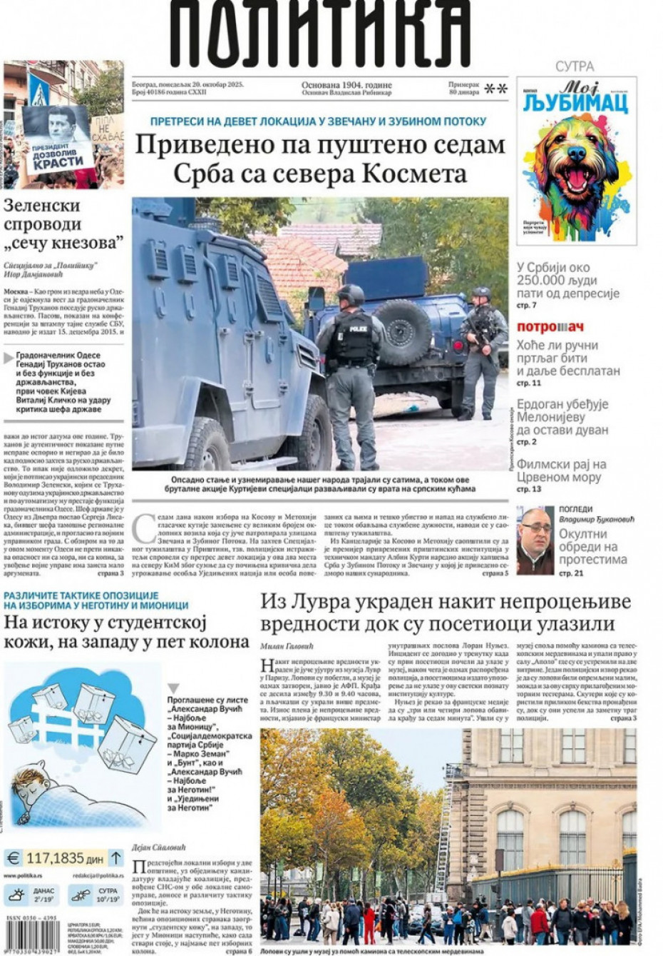 Pogledajte šta na naslovnim stranama donose dnevne novine u Srbiji u izdanju za ponedeljak, 20. oktobar