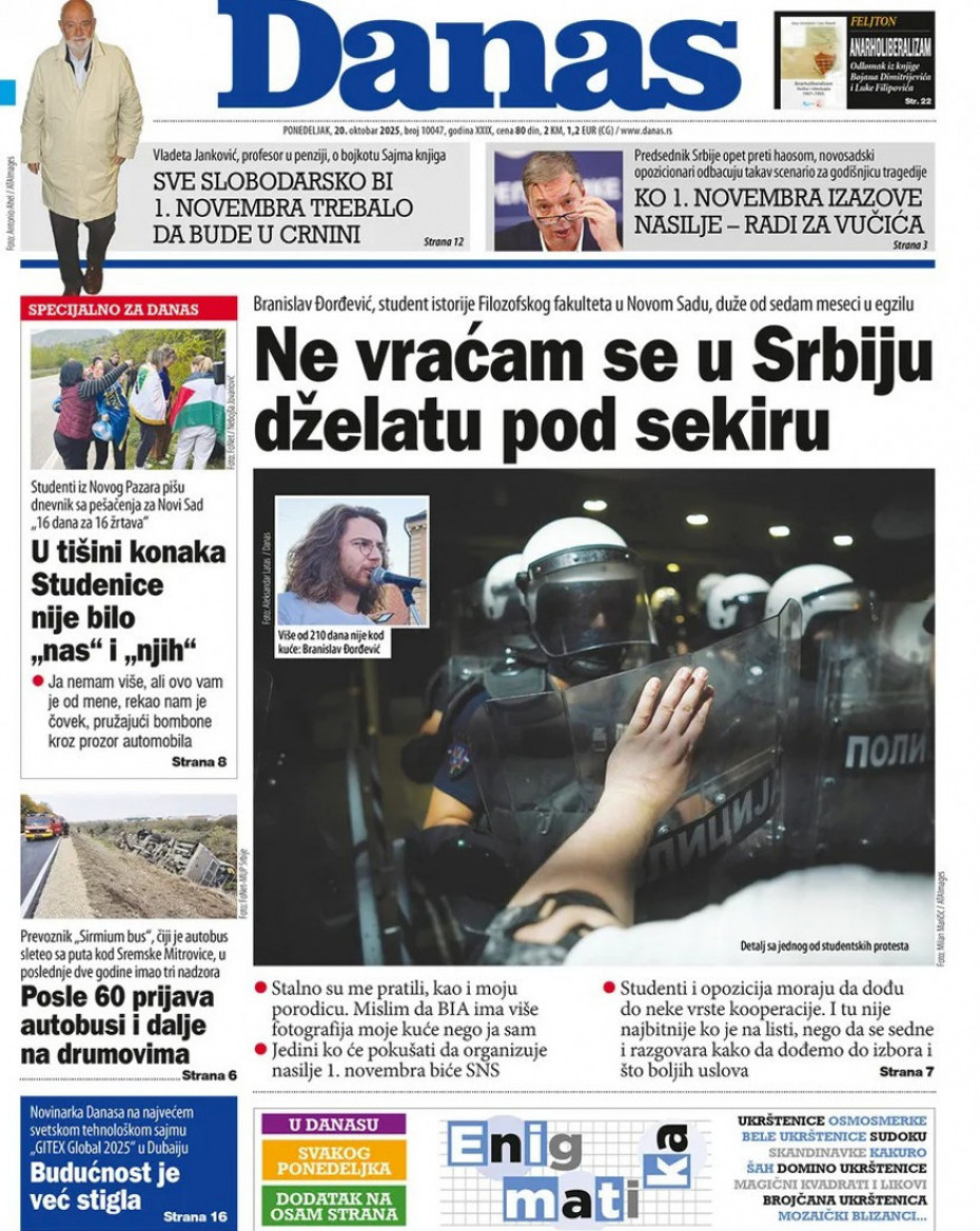 Naslovne strane dnevne štampe za ponedeljak, 20. oktobar