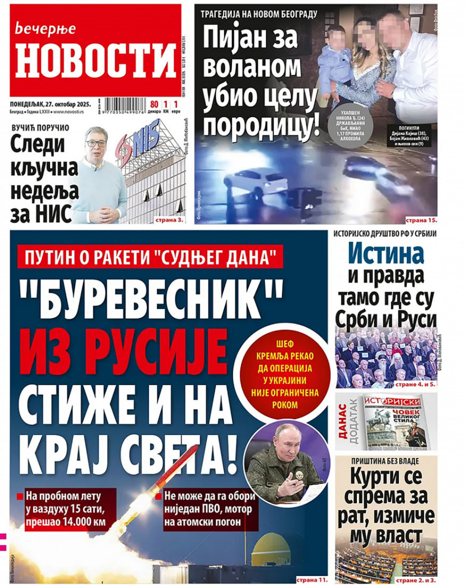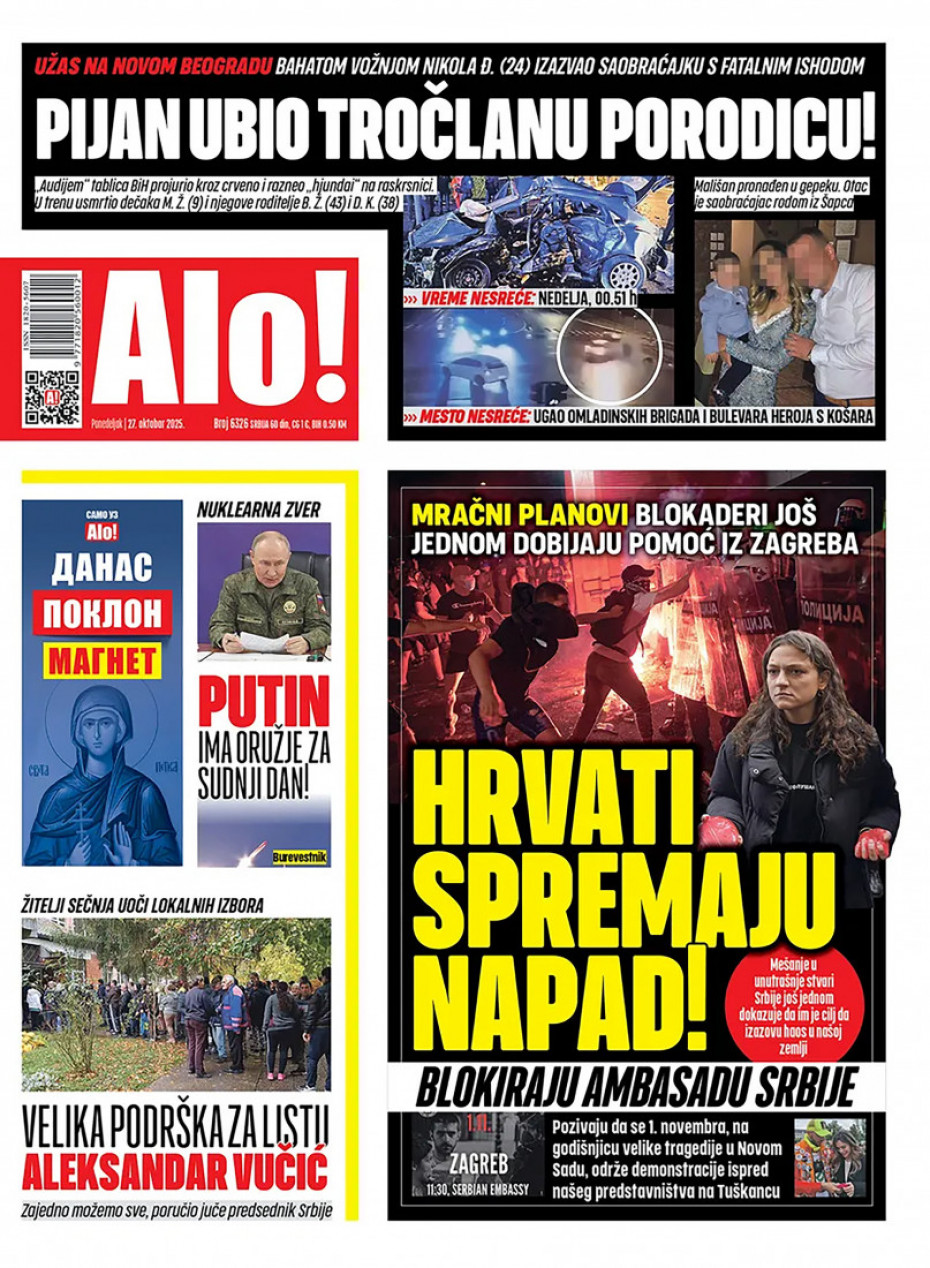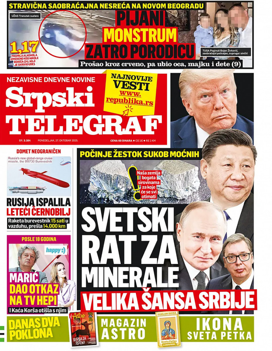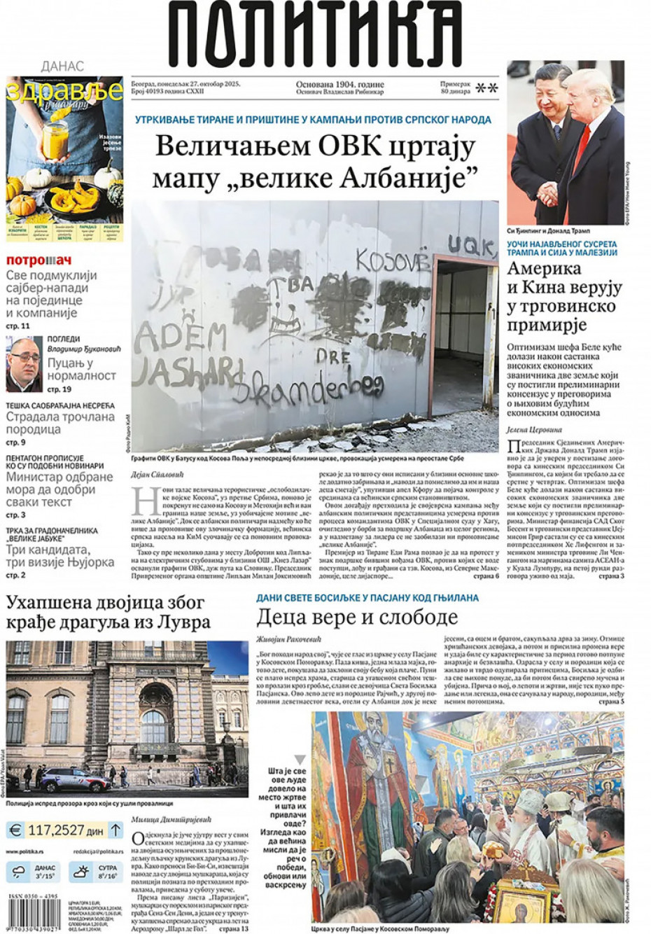 Pogledajte šta na naslovnim stranama donose dnevne novine u Srbiji u izdanju za ponedeljak, 27. oktobar