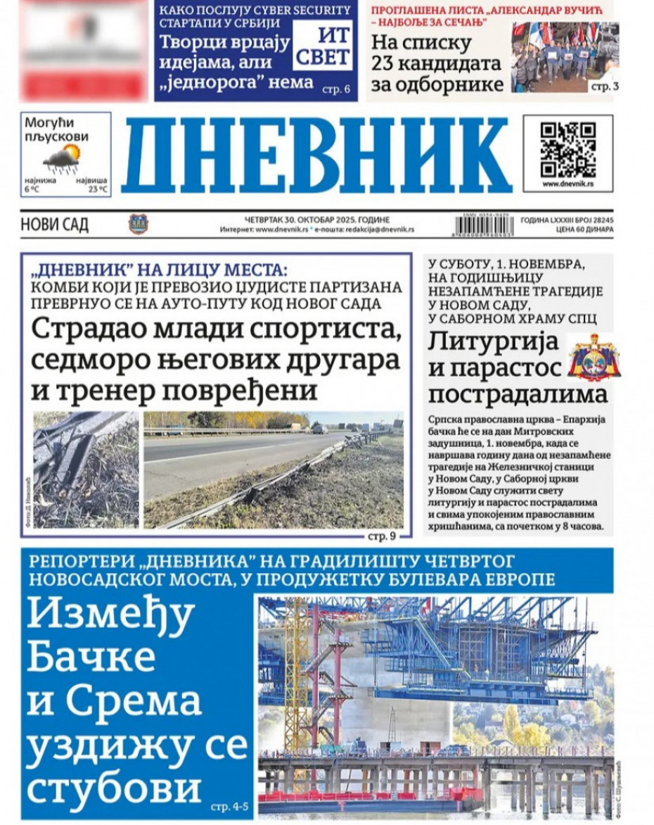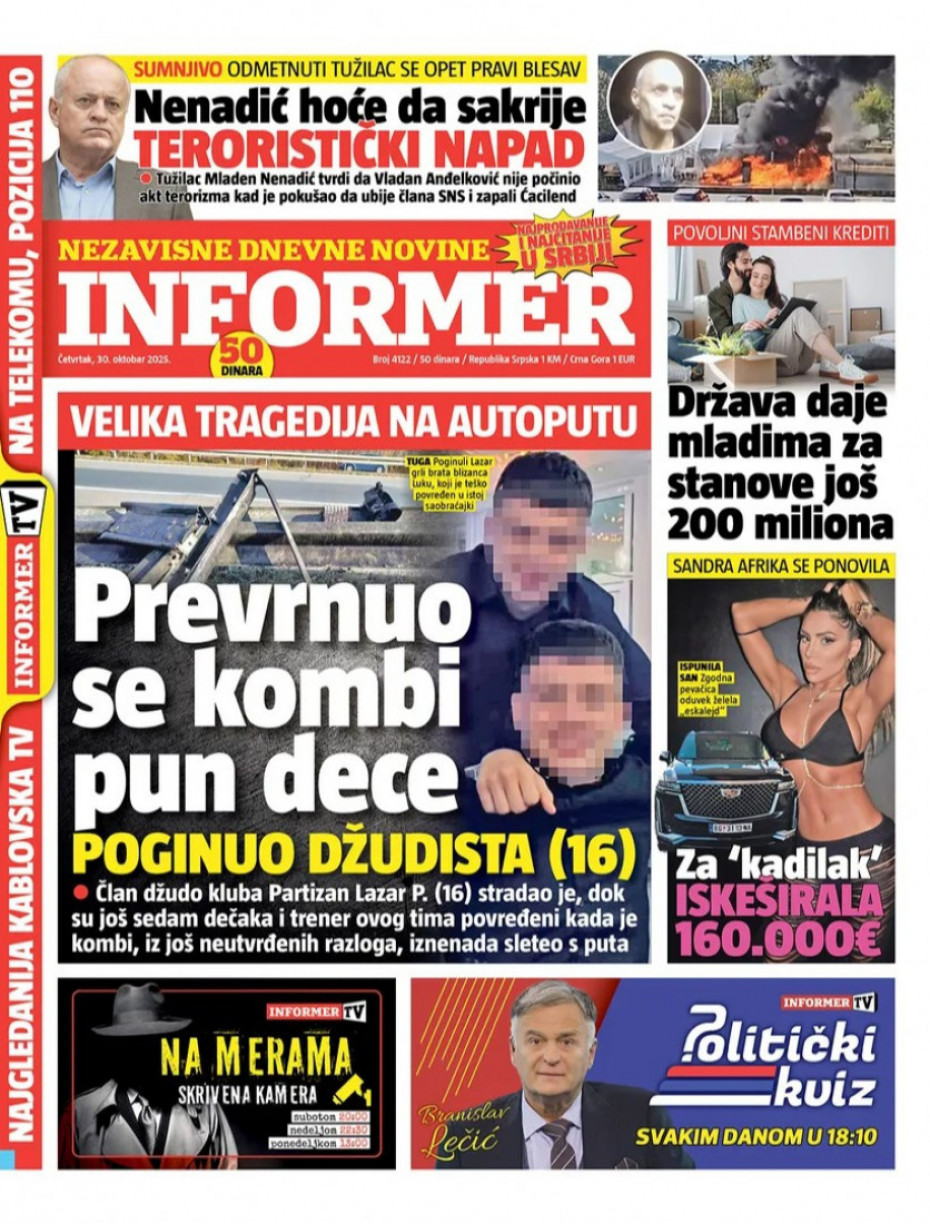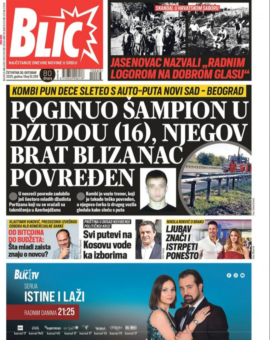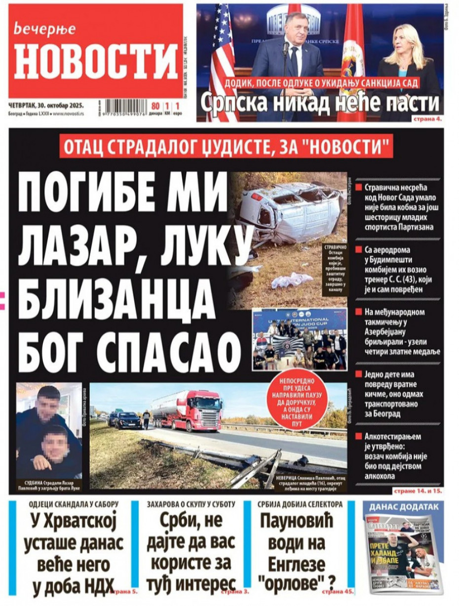Aktuelno Povratak sa takmičenja u Azerebejdžanu pretvoren u tragediju: Džudista Partizana (16) poginuo u prevrtanju kombija Šestoro dece i četrdesetrogodišnji vozač, koji su hospitalizovani u Novom Sadu, nalaze se u stabilnom opštem stanju 29/10/2025 19:40 https://www.euronews.rs/srbija/aktuelno/194313/teska-nesreca-kod-novog-sada-poginuo-16-godisnjak/vest pročitaj celu vest
