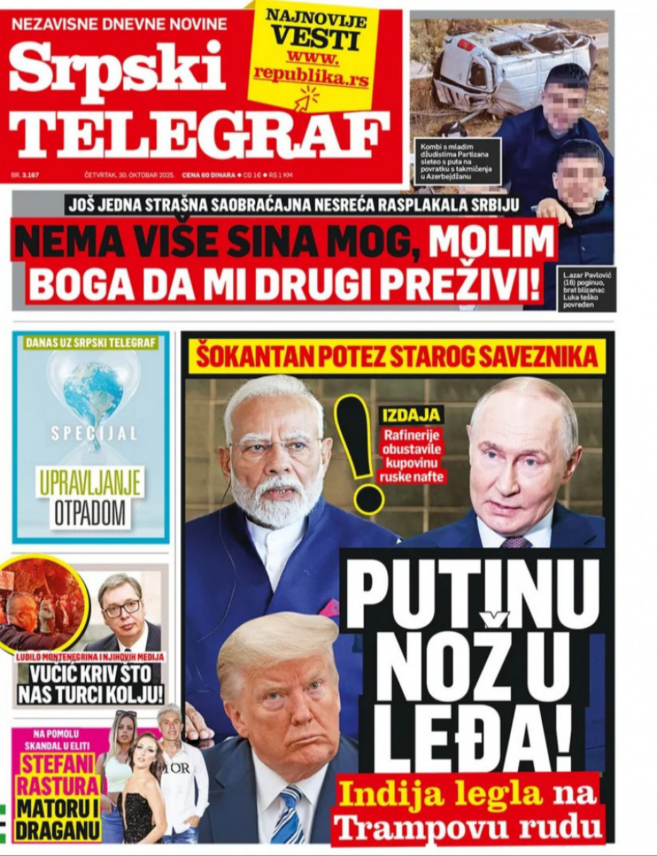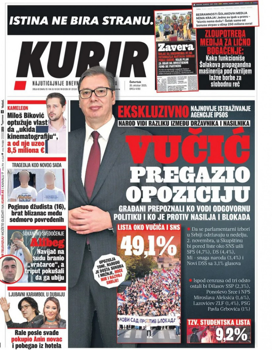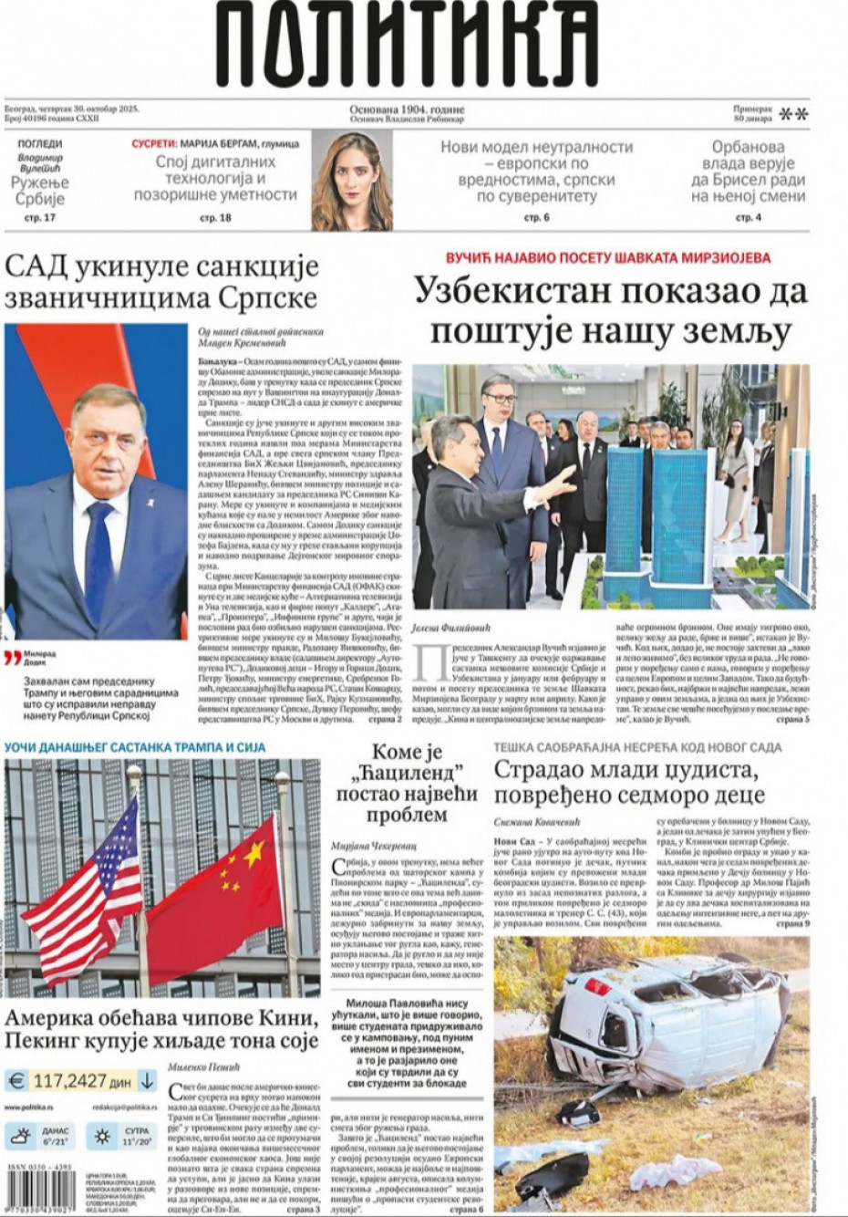 Naslovna Srbija Politika Politika Naslovne strane dnevne štampe za četvrtak, 30. oktobar Komentari Profimedia, Logo - Copyright Profimedia, Logo Autor: Euronews Srbija 29/10/2025 - 20:30 Podeli veličina teksta Aa Aa Pogledajte šta na naslovnim stranama donose dnevne novine u Srbiji u izdanju za četvrtak, 30. oktobar. Promo Pogledaj galeriju Promo Pogledaj galeriju Promo Pogledaj galeriju Promo Pogledaj galeriju Promo Pogledaj galeriju Promo Pogledaj galeriju Promo Pogledaj galeriju Promo Pogledaj galeriju Promo Pogledaj galeriju Više o... Dnevne novine Vesti Srbija Novosti Naslovne strane Naslovne strane sutrašnjih novina Top tagovi Euronews Montenegro Kosovo i Metohija Rat u Ukrajini Kriza na Bliskom istoku