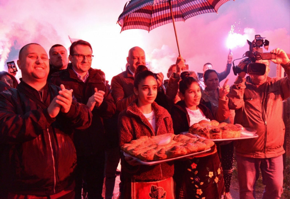 Srbe su građani dočekali kod jezera Očaga na ulazu u Lazaravac uz srpske rodoljubive pesme sa motivima sa KiM, uz paljenje vatrometa i bakljadu, kao i uz pogaču i so.