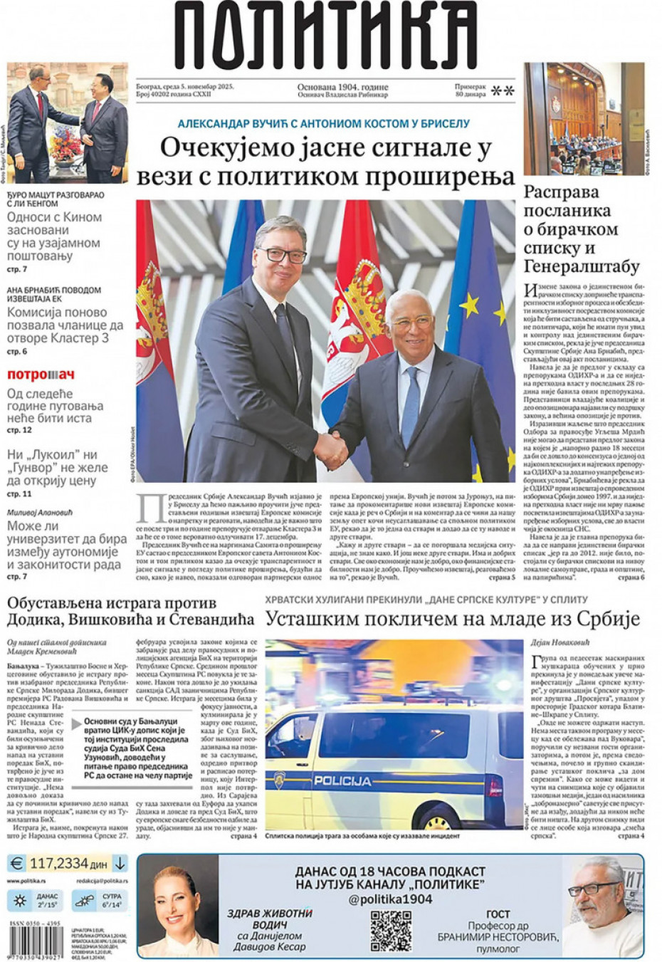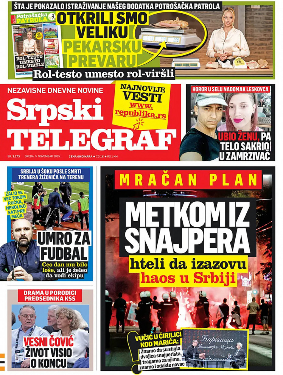 Naslovne strane dnevne štampe za sredu, 5. novembar
