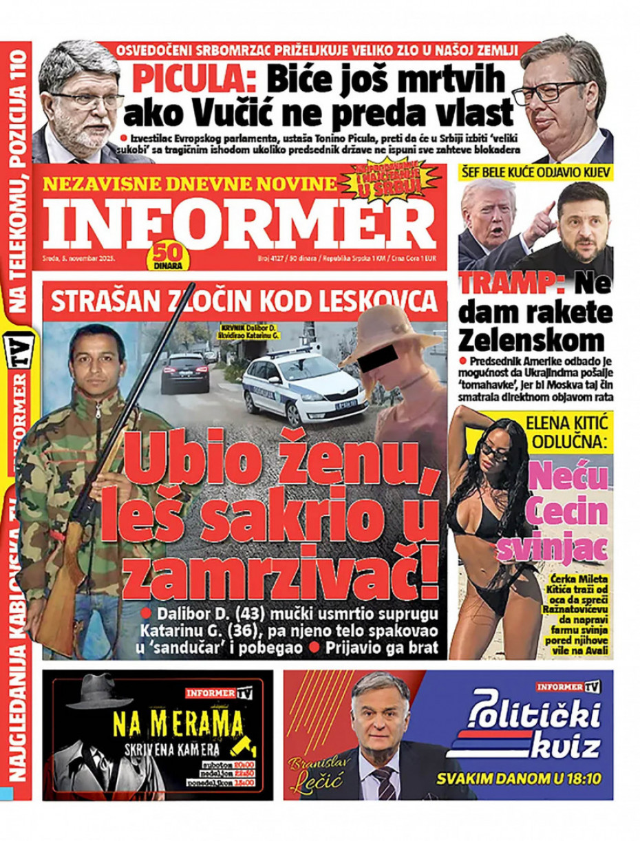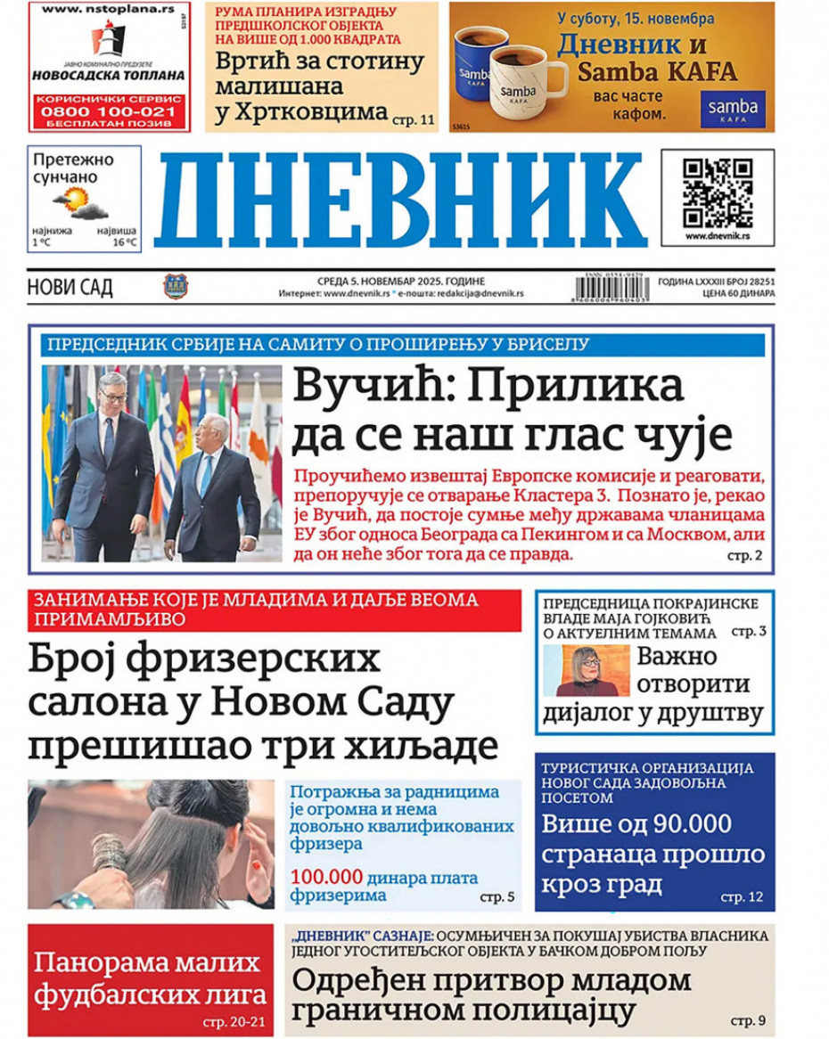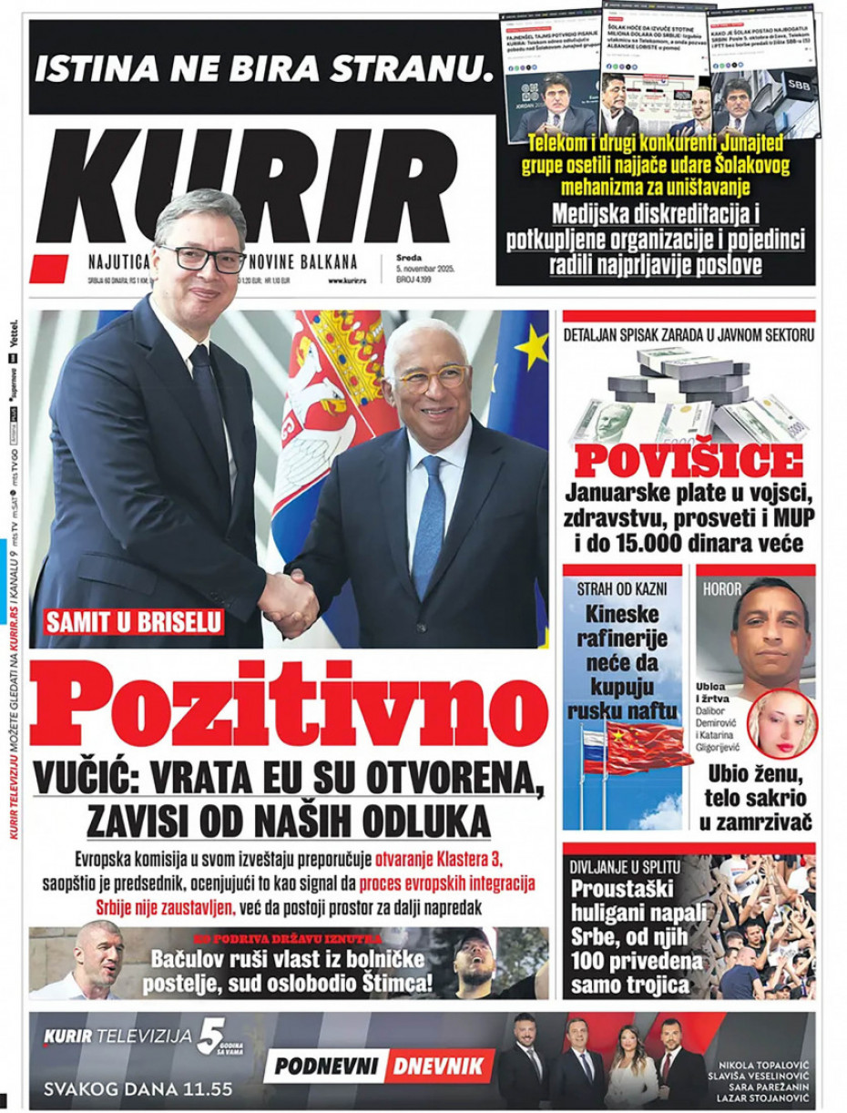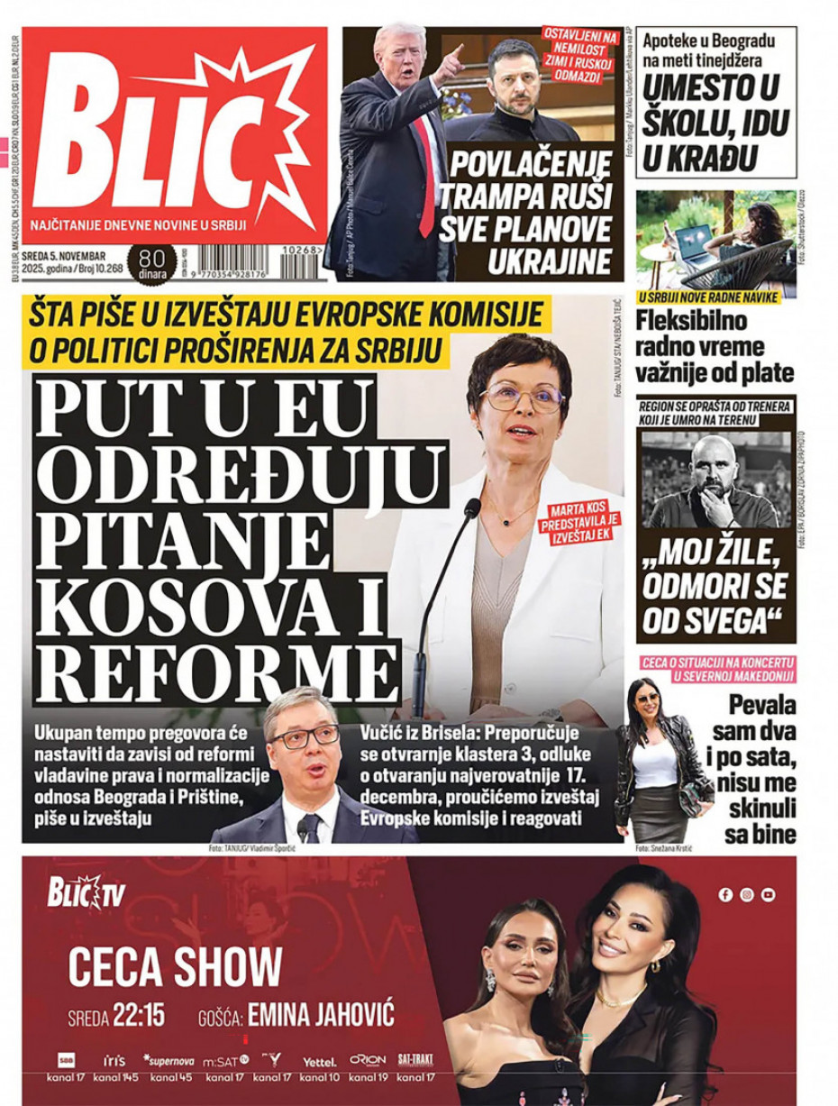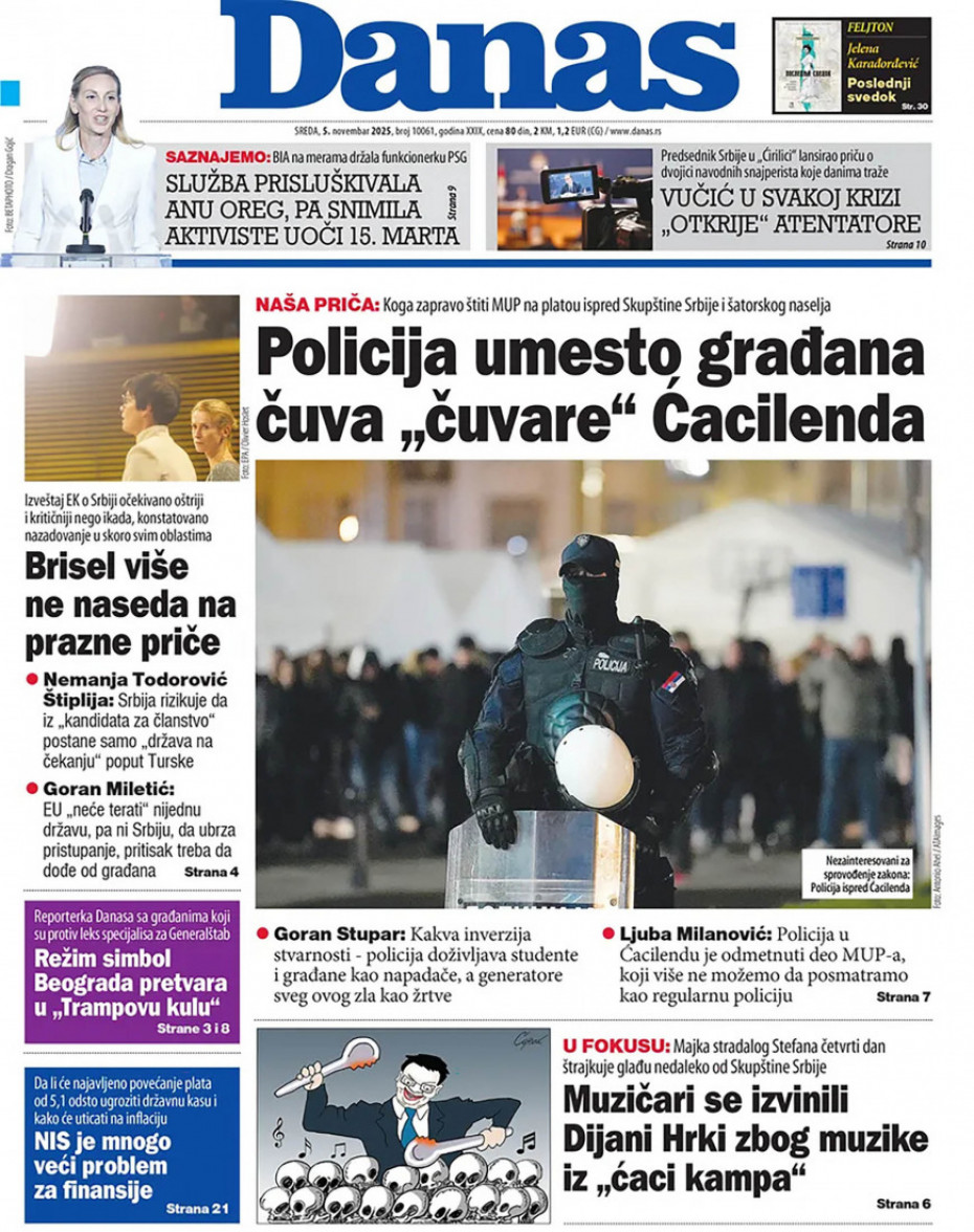 Pogledajte šta na naslovnim stranama donose dnevne novine u Srbiji u izdanju za sredu, 5. novembar