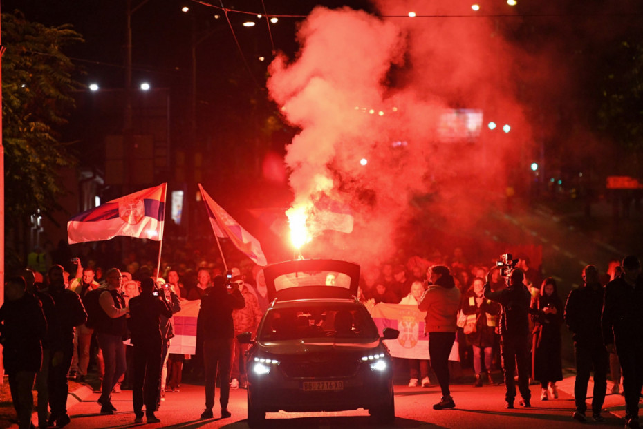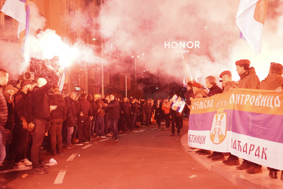 Građani nose zastave Srbije, kao i transparent "Srbija se pokoriti neće, dok se Vučić po Srbiji kreće", "Srbi sa Kosova i Metohije za Srbiju protiv nasilja", zapaljene su baklje, a pušta se srpska tradicionalna muzika.