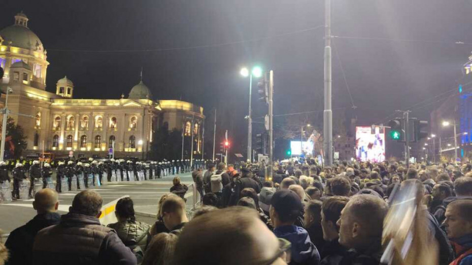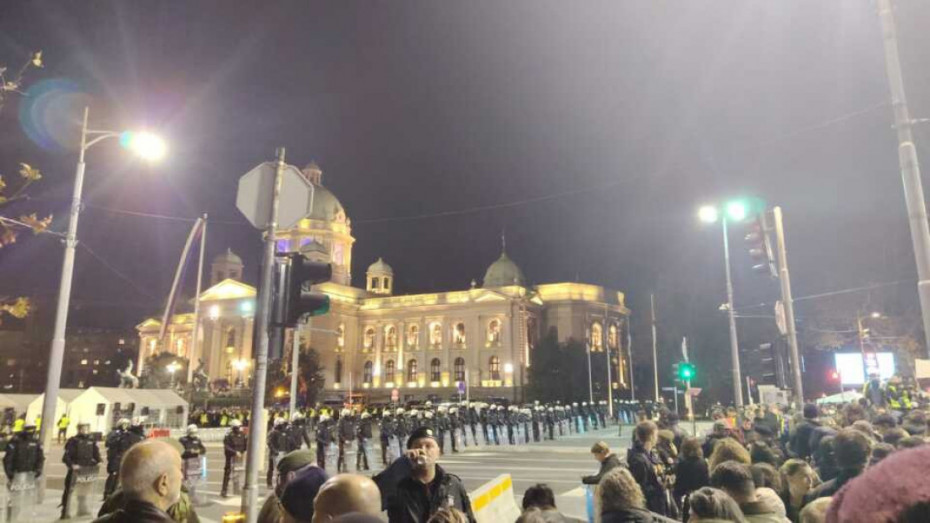 U neposrednoj blizini su građani koji pružaju podršku majci nastradalog mladića u padu nadstrešnice na železničkoj stanici u Novom Sadu, Dijani Hrki. Dve grupe su odvojene ogradom i kordonima policije u opremi za razbijanje demonstracija.
