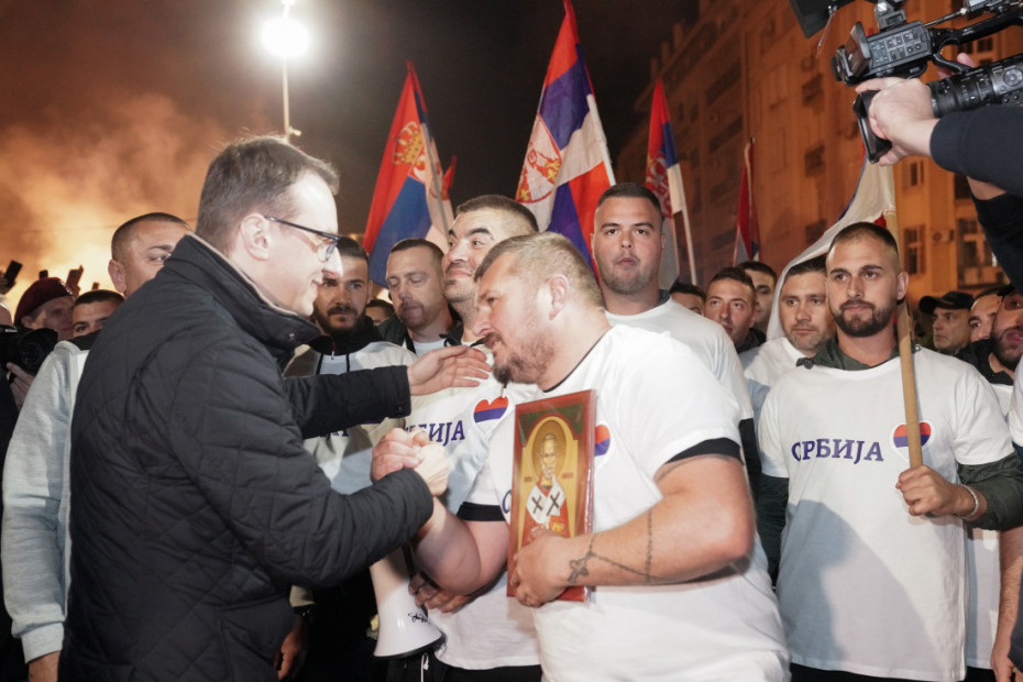 "Ovde smo na veličanstvenom skupu ispred Skupštine Srbije da podržimo naše heroje, naše pešake sa KiM koji zajedno sa drugim našim građanima Srbije od Raške do Beograda pešače put Novog Sada da podrže predsednika Aleksandra Vučića na velikom narodnom skupu protiv blokada, protiv nasilja. I na tom putu ovde u Beogradu smo došli da ih dočekamo, da im pružimo podršku", rekao je Petković.