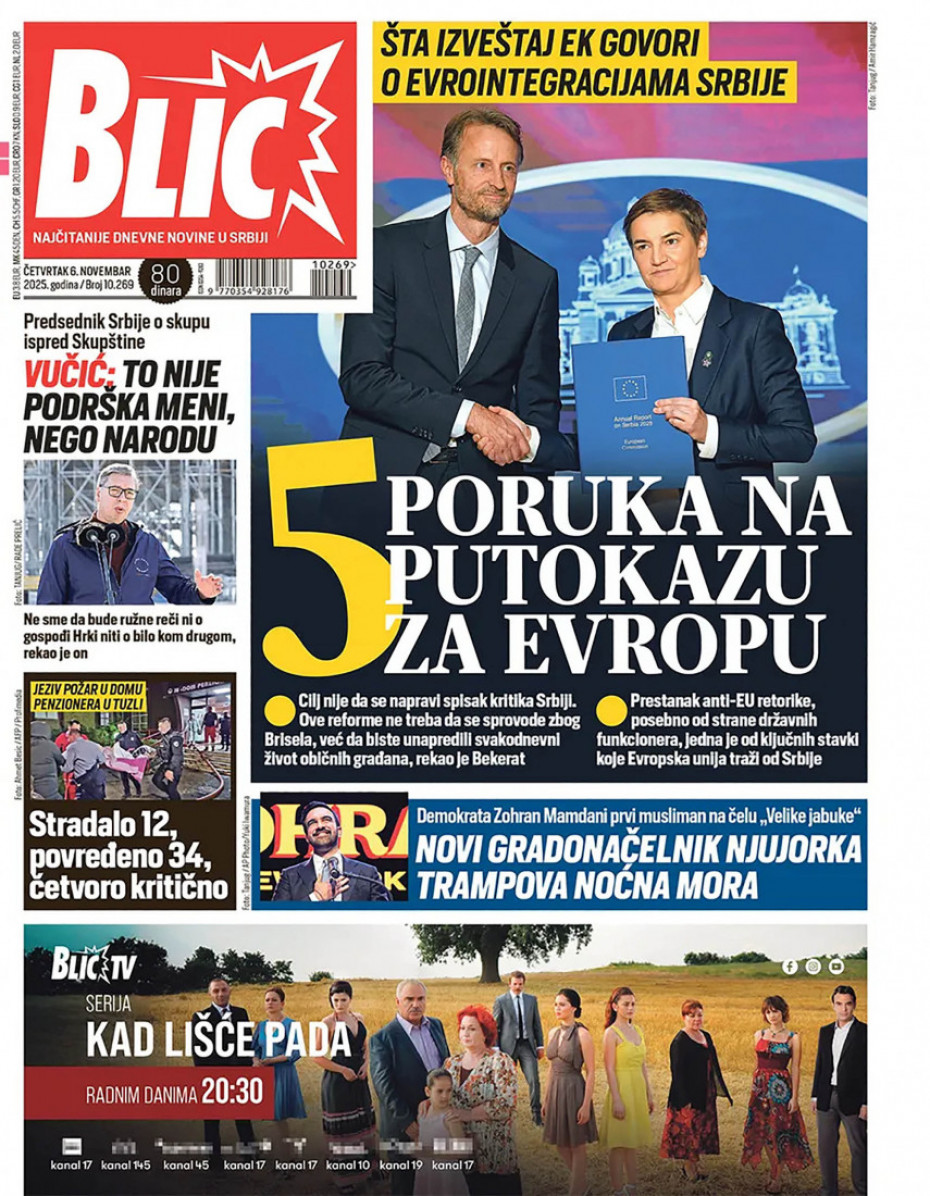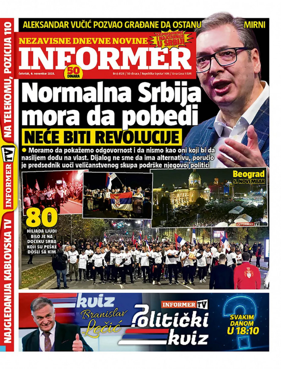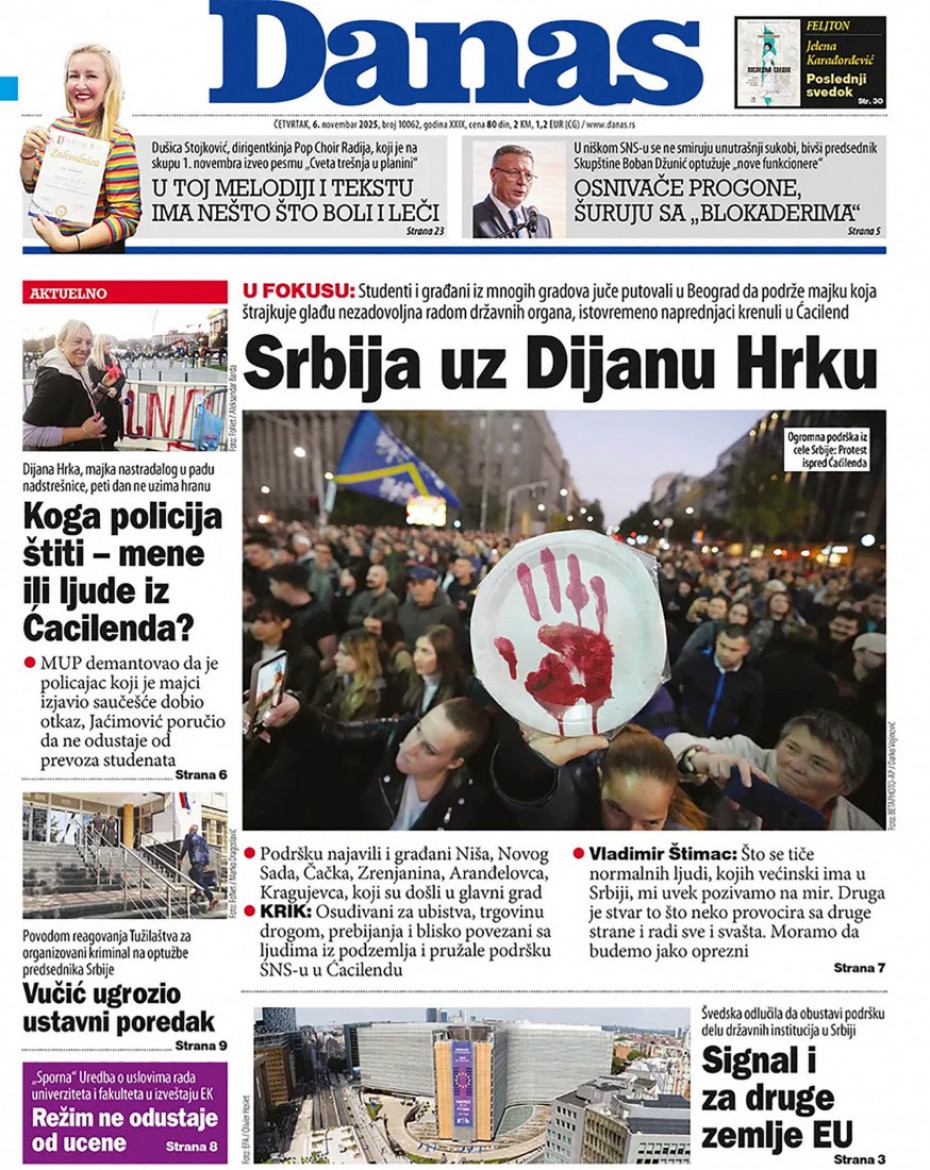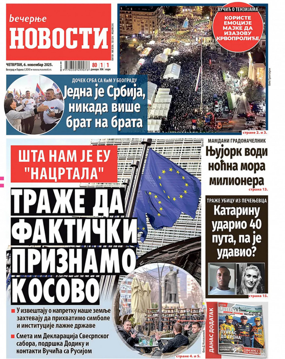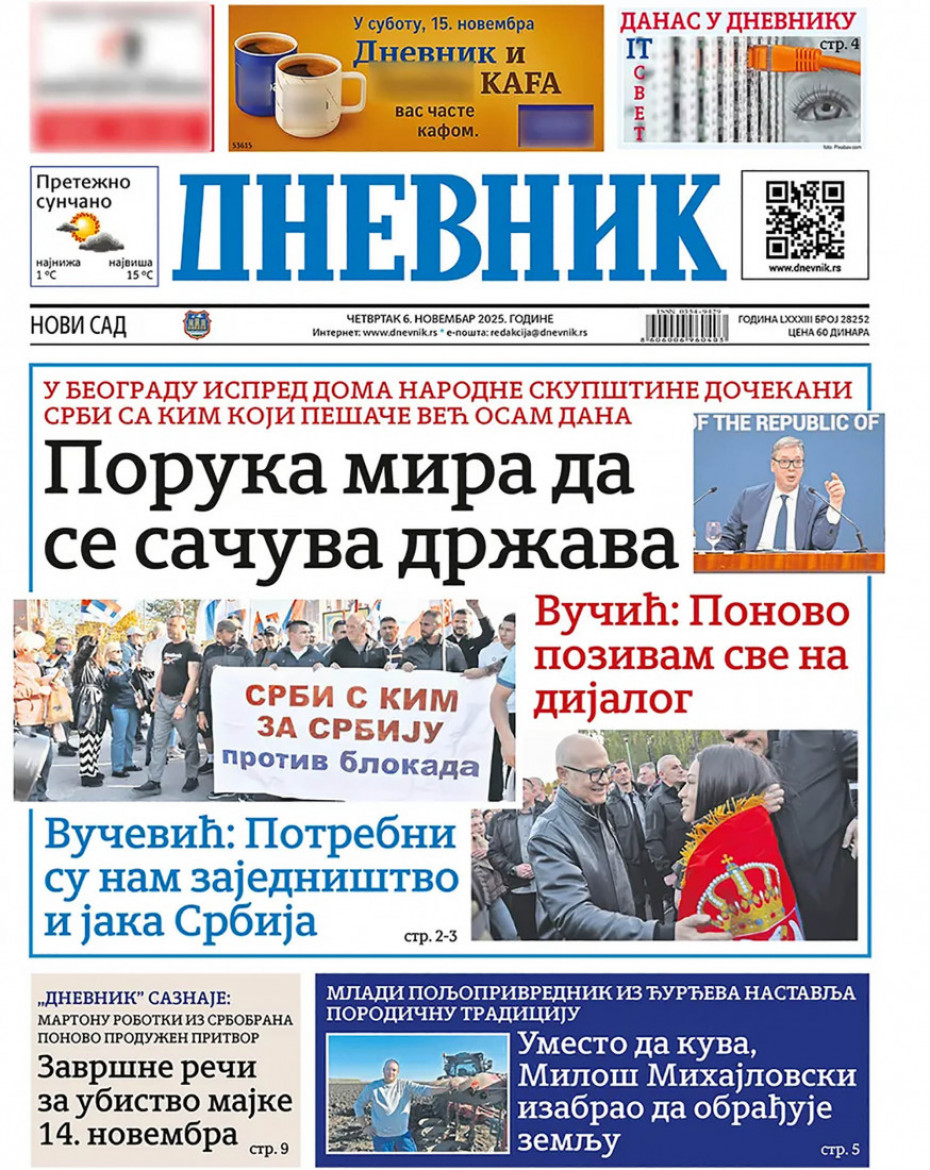 Pogledajte šta na naslovnim stranama donose dnevne novine u Srbiji u izdanju za četvrtak, 6. novembar