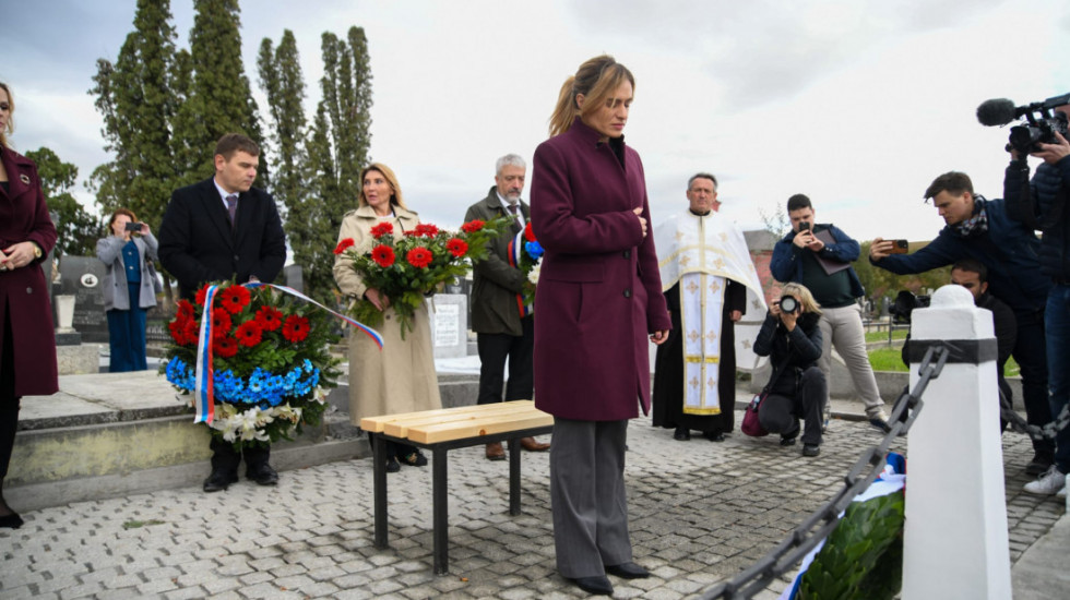 "Bela Crkva je bila simbol našeg bratstva, našeg zajedničkog stradanja, našeg prijateljstva i naše solidarnosti", rekla je ministarka koja je danas, na dan godišnjice Oktobarske revolucije, položila cveće na dva spomen obeležja u Ruskom nekropolju - na Spomenik kadetima, nastavnicima, vaspitačima i radnicima u kadetskom korpusu, kao i na Spomenik poginulim srpskim ratnicima u Prvom svetskom ratu.