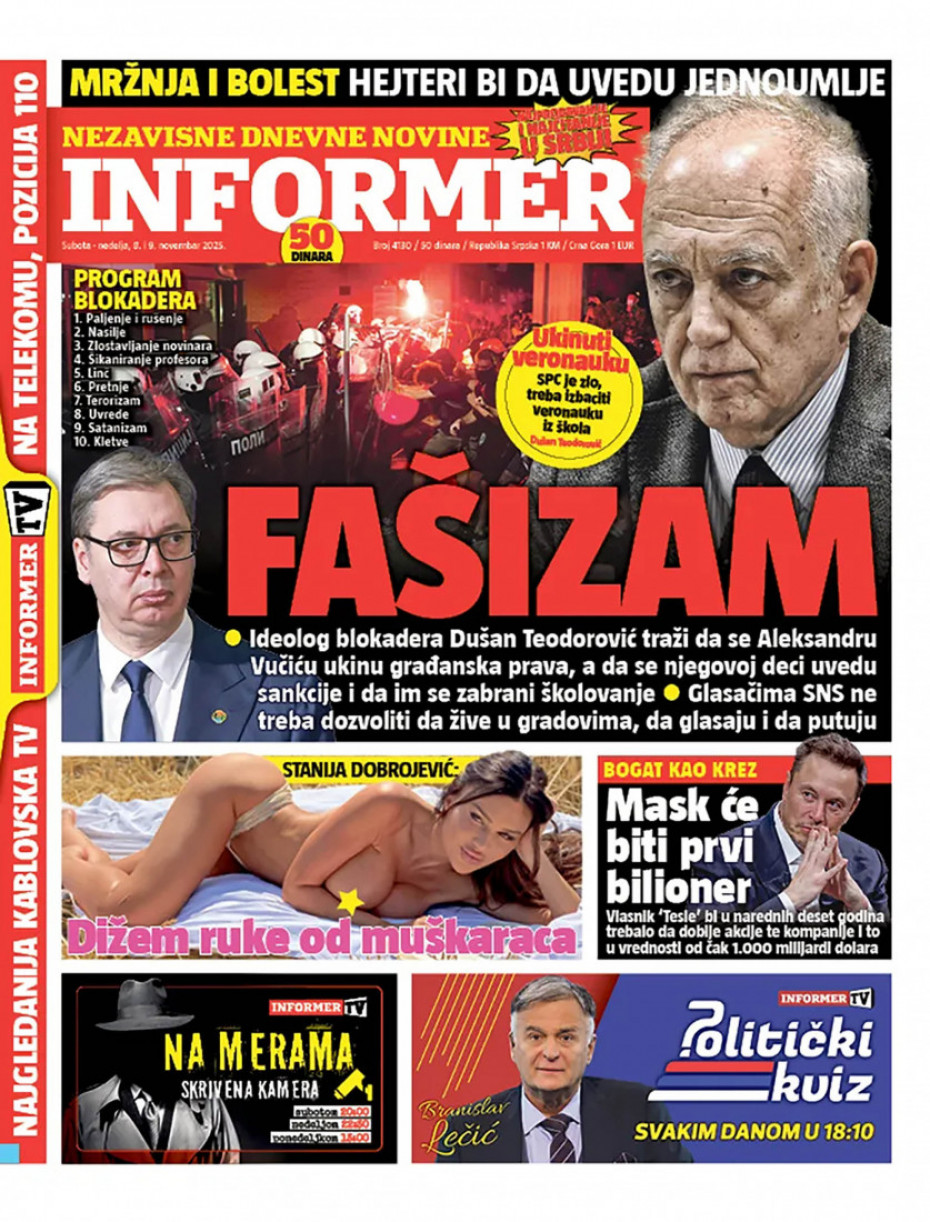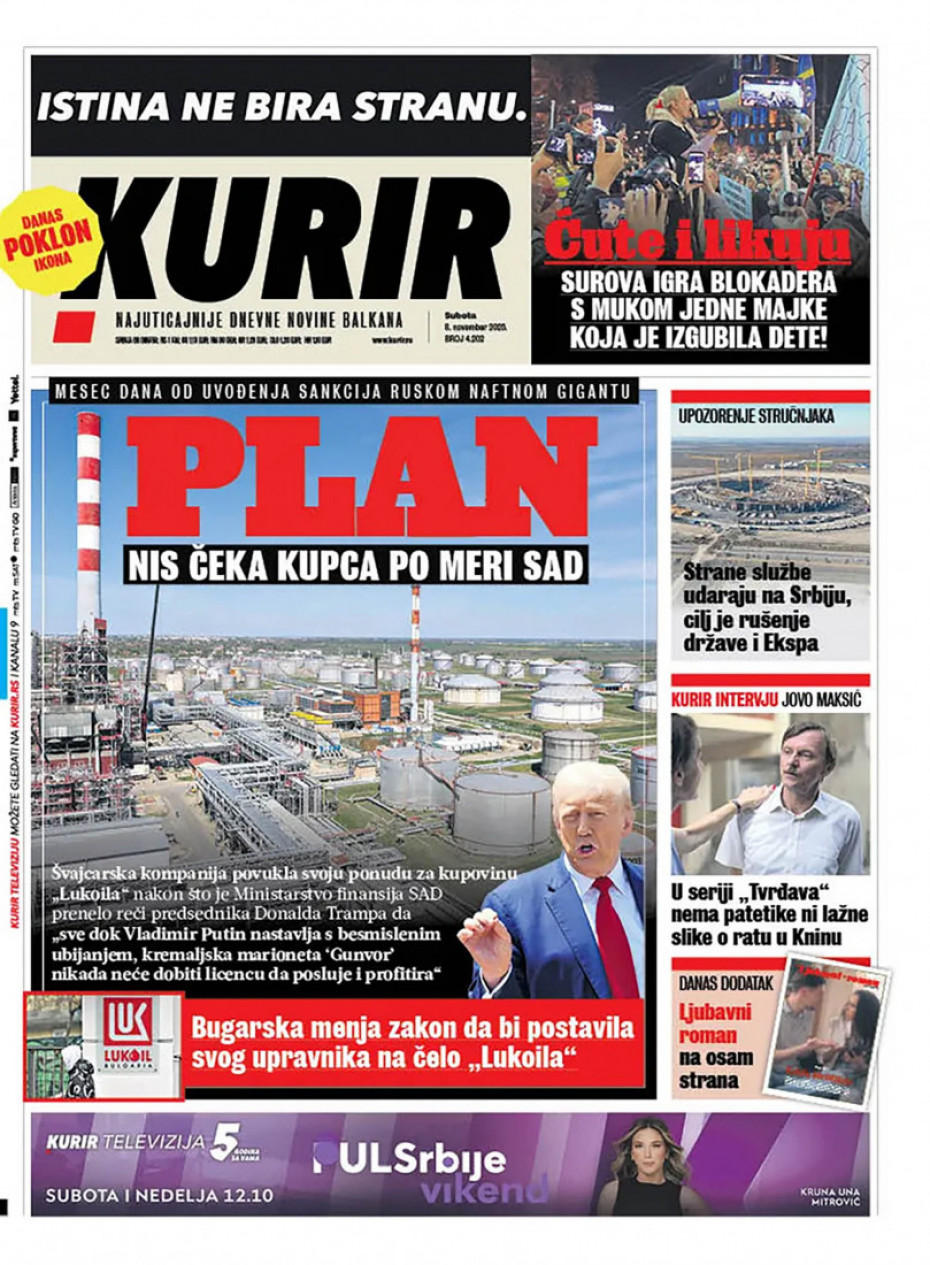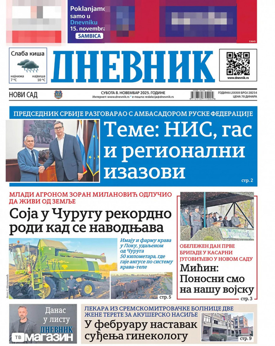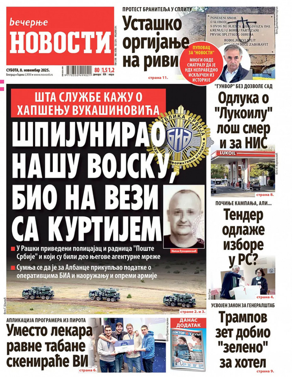 Naslovna Srbija Politika Politika Naslovne strane dnevne štampe za subotu, 8. novembar Komentari Profimedia, Logo - Copyright Profimedia, Logo Autor: Euronews Srbija 07/11/2025 - 21:07 Podeli veličina teksta Aa Aa Pogledajte šta na naslovnim stranama donose dnevne novine u Srbiji u izdanju za subotu, 8. novembar. Promo Pogledaj galeriju Promo Pogledaj galeriju Promo Pogledaj galeriju Promo Pogledaj galeriju Promo Pogledaj galeriju Promo Pogledaj galeriju Promo Pogledaj galeriju Promo Pogledaj galeriju Promo Pogledaj galeriju Više o... Naslovne strane Euronews Srbija Dnevne novine Vesti Top tagovi Euronews Montenegro Kosovo i Metohija Rat u Ukrajini Kriza na Bliskom istoku