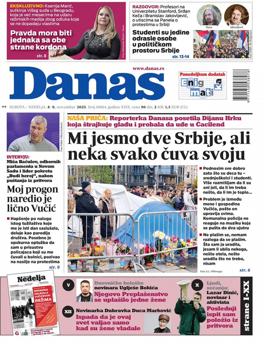 Društvo Dijana Hrka štrajkuje glađu šest dana, ispred skupštine mirno Između Doma Narodne skupštine i Takovske ulice raspoređena je policija. 07/11/2025 08:03 https://www.euronews.rs/srbija/drustvo/195583/dijana-hrka-strajkuje-gladu-sest-dana/vest pročitaj celu vest