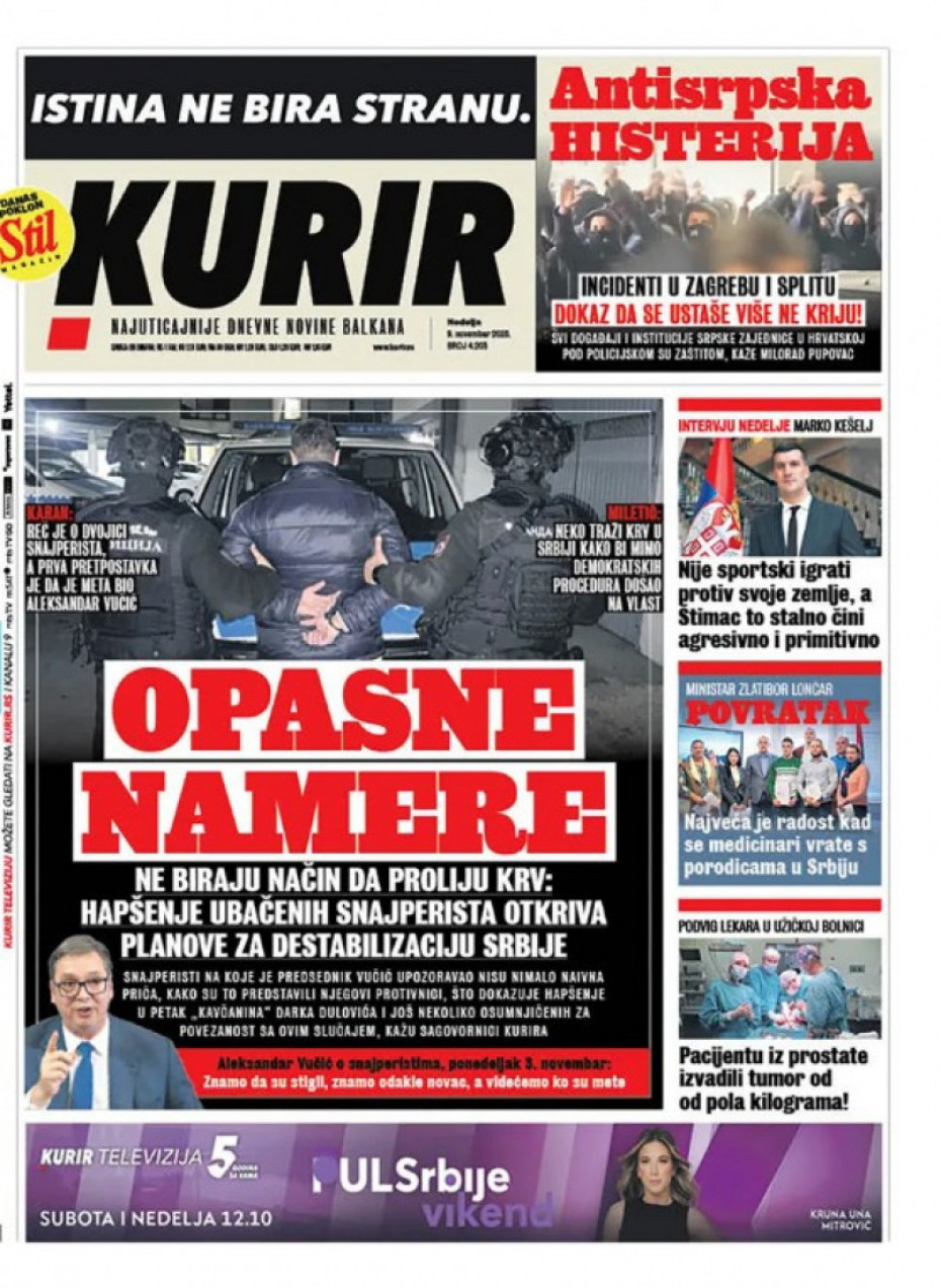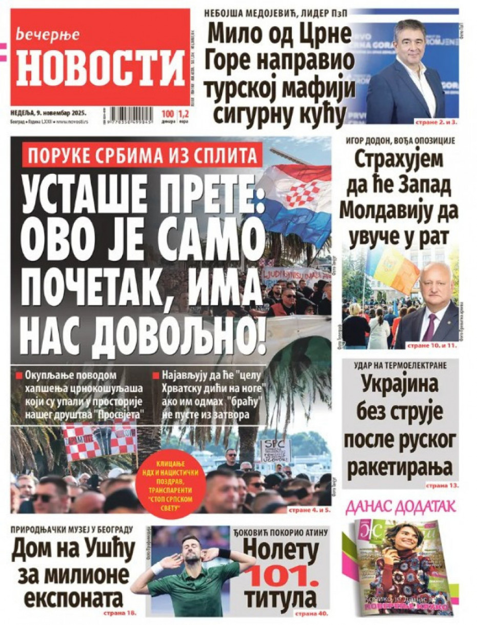 Naslovna Srbija Politika Politika Naslovne strane dnevne štampe za nedelju, 9. novembar Komentari Profimedia, Logo - Copyright Profimedia, Logo Autor: Euronews Srbija 08/11/2025 - 21:04 Podeli veličina teksta Aa Aa Pogledajte šta na naslovnim stranama donose dnevne novine u Srbiji u izdanju za nedelju, 9. novembar Promo Pogledaj galeriju Promo Pogledaj galeriju Promo Pogledaj galeriju Promo Pogledaj galeriju Promo Pogledaj galeriju Promo Pogledaj galeriju Promo Pogledaj galeriju Promo Pogledaj galeriju Promo Pogledaj galeriju Više o... Naslovne strane Sutrašnje naslovnice Dnevna štampa Naslovne strane sutrašnjih novina Top tagovi Euronews Montenegro Kosovo i Metohija Rat u Ukrajini Kriza na Bliskom istoku