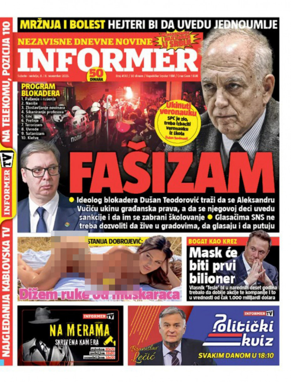 Politika Naslovne strane dnevne štampe za nedelju, 9. novembar Pogledajte šta na naslovnim stranama donose dnevne novine u Srbiji u izdanju za nedelju, 9. novembar 08/11/2025 21:04 https://www.euronews.rs/srbija/politika/195827/naslovne-strane-dnevne-stampe-za-nedelju-9-novembar/vest pročitaj celu vest