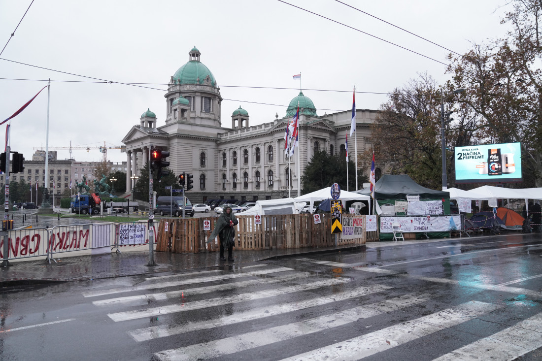 U blizini Doma Narodne skupštine, na raskrsnici Takovske i Bulevara kralja Aleksandra, nalazi se šator u kojem je Dijana Hrka, čiji je sin nastradao u padu nadstrešnice na Železničkoj stanici u Novom Sadu, a koja od nedelje, 2. novembra, štrajkuje glađu zahtevajući da se utvrdi odgovornost za smrt njenog sina i ostalih nastradalih u padu nadstrešnice. Sa Hrkom je i manja grupa građana koji joj pružaju podršku.
