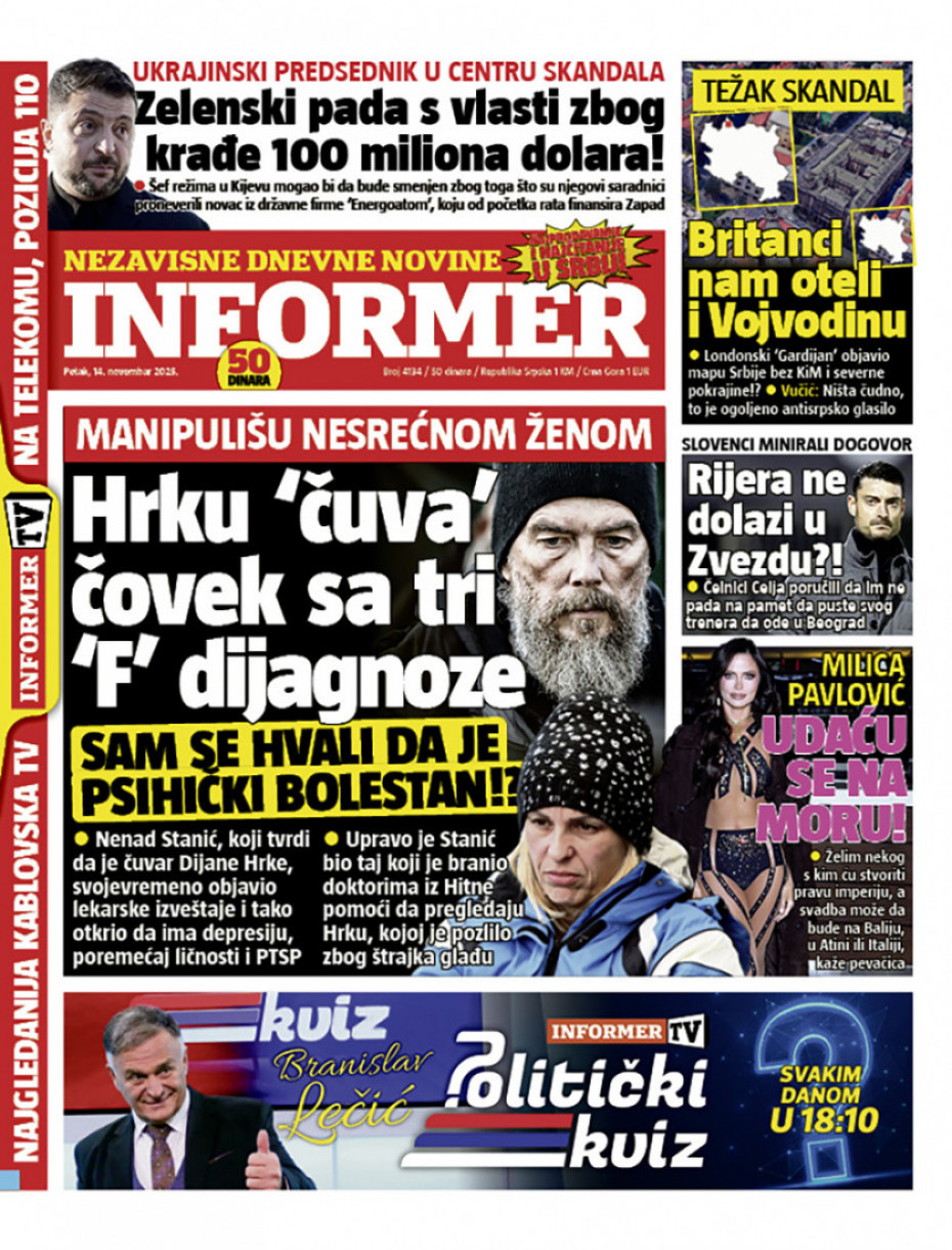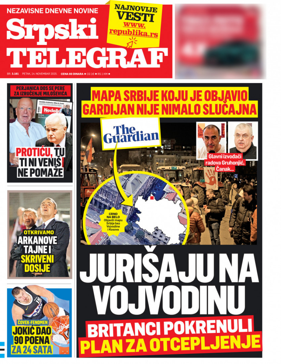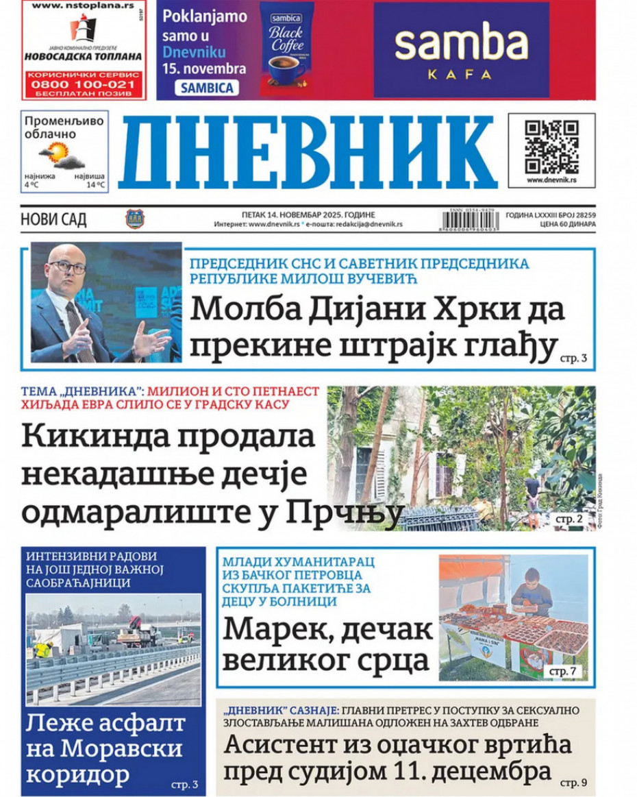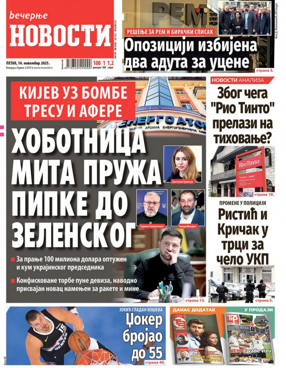Pogledajte šta na naslovnim stranama donose dnevne novine u Srbiji u izdanju za petak, 14. novembar.