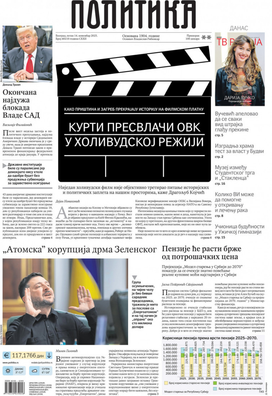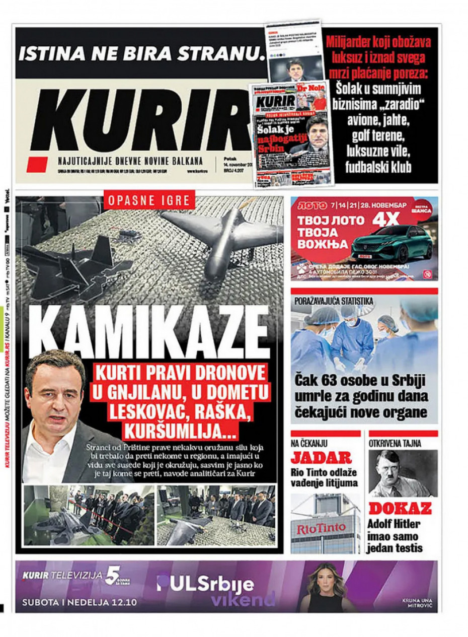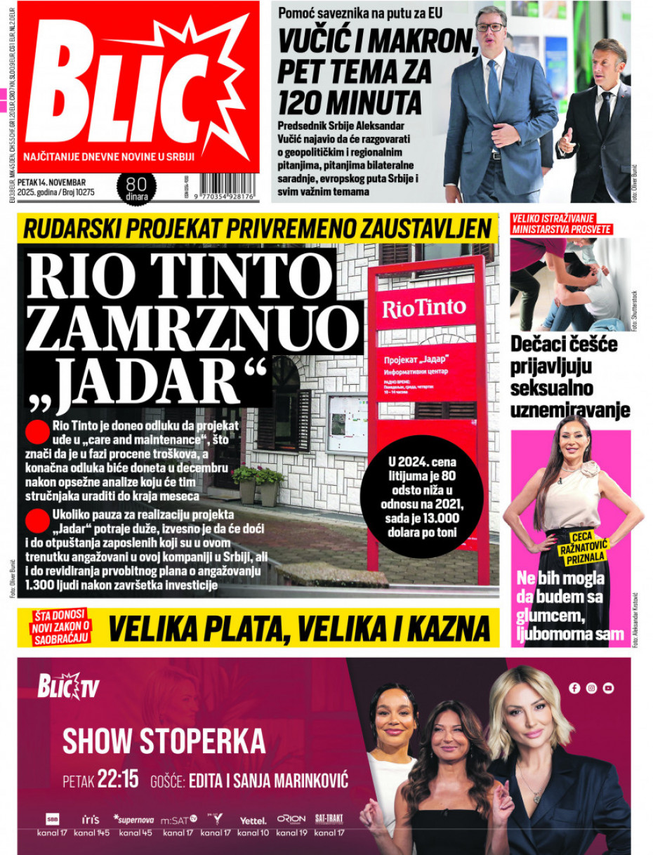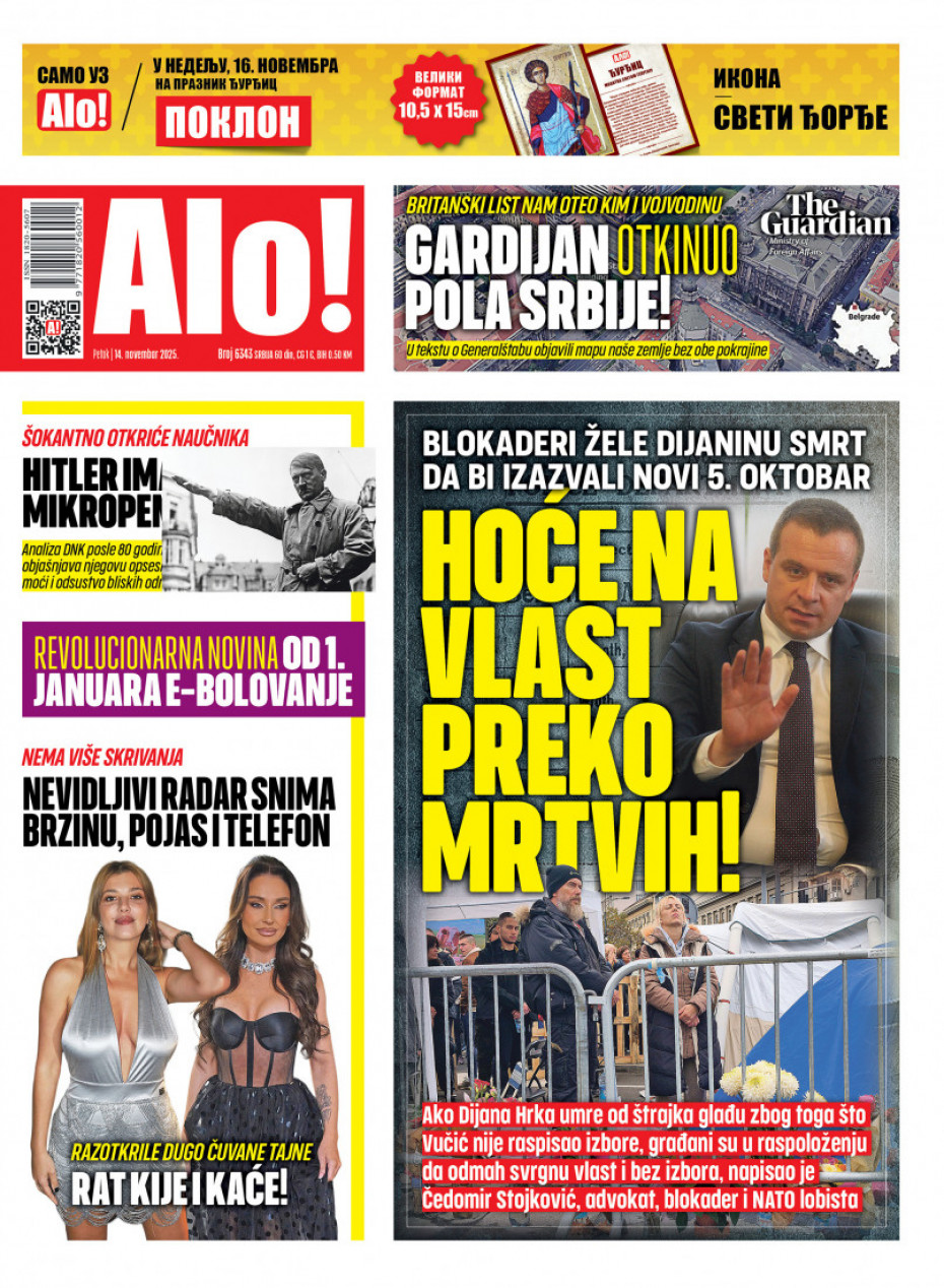 Pogledajte šta na naslovnim stranama donose dnevne novine u Srbiji u izdanju za petak, 14. novembar.