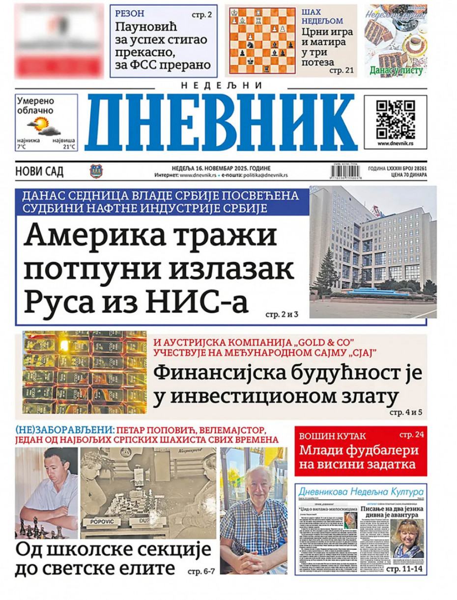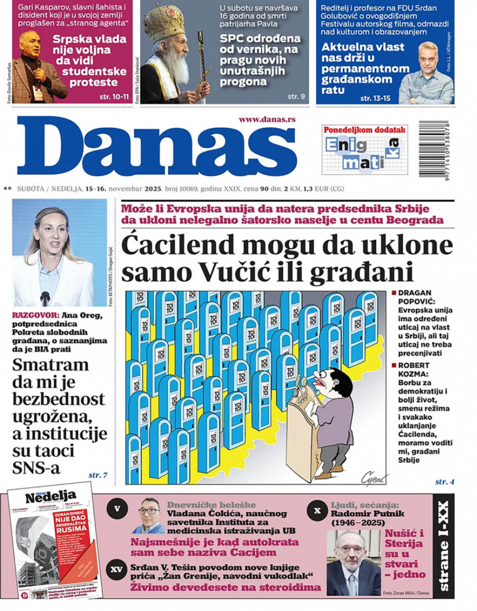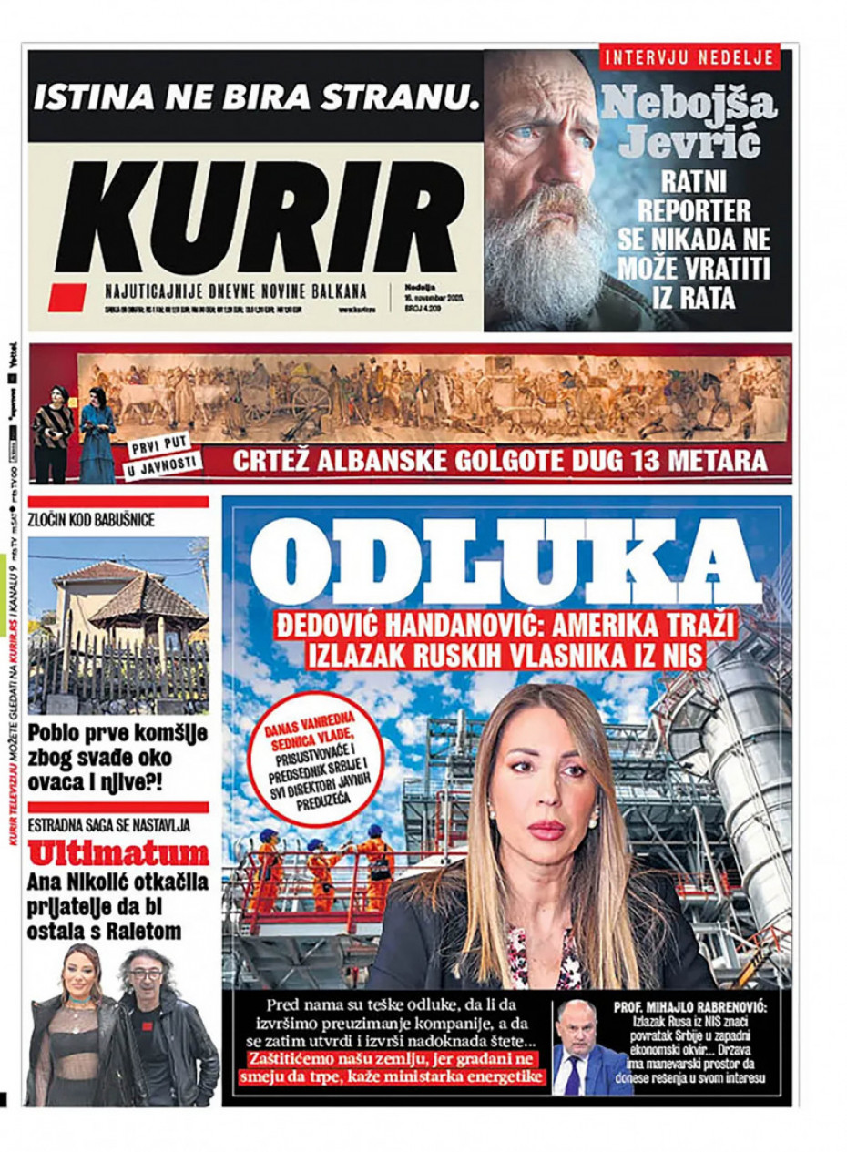 Politika Naslovne strane dnevne štampe za nedelju, 16. novembar Pogledajte šta na naslovnim stranama donose dnevne novine u Srbiji u izdanju za nedelju, 16. novembar 15/11/2025 20:34 https://www.euronews.rs/srbija/politika/196849/naslovne-strane-dnevne-stampe-za-nedelju-16-novembar/vest pročitaj celu vest