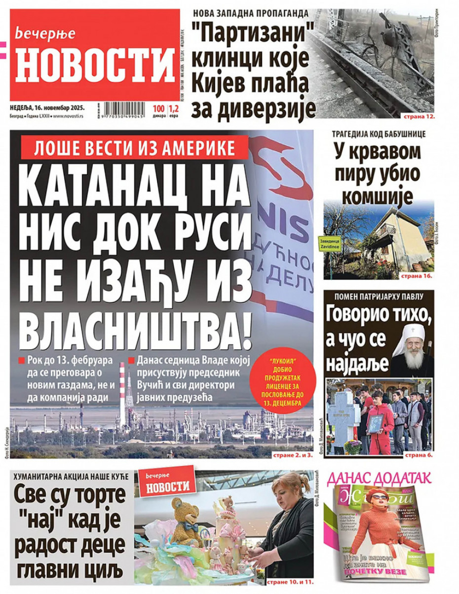 Naslovna Srbija Politika Politika Naslovne strane dnevne štampe za nedelju, 16. novembar Komentari Profimedia, Logo - Copyright Profimedia, Logo Autor: Euronews Srbija 15/11/2025 - 20:34 Podeli veličina teksta Aa Aa Pogledajte šta na naslovnim stranama donose dnevne novine u Srbiji u izdanju za nedelju, 16. novembar. Promo Pogledaj galeriju Promo Pogledaj galeriju Promo Pogledaj galeriju Promo Pogledaj galeriju Promo Pogledaj galeriju Promo Pogledaj galeriju Promo Pogledaj galeriju Promo Pogledaj galeriju Više o... Naslovne strane Naslovne strane sutrašnjih novina Dnevna štampa Dnevna štampa u Srbiji Top tagovi Euronews Montenegro Kosovo i Metohija Rat u Ukrajini Kriza na Bliskom istoku