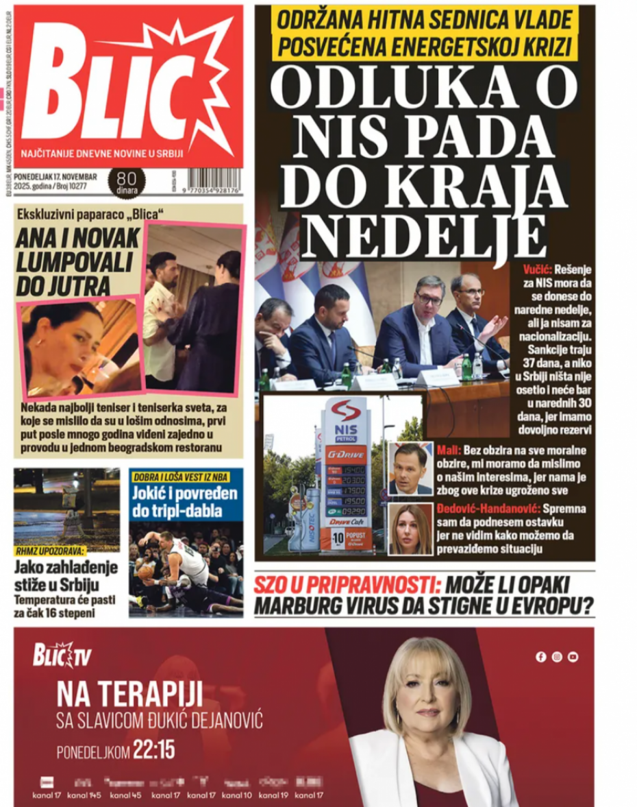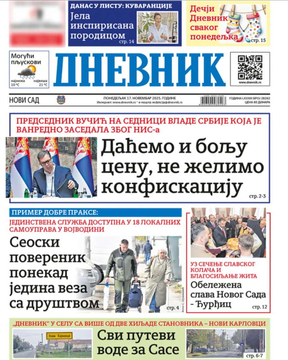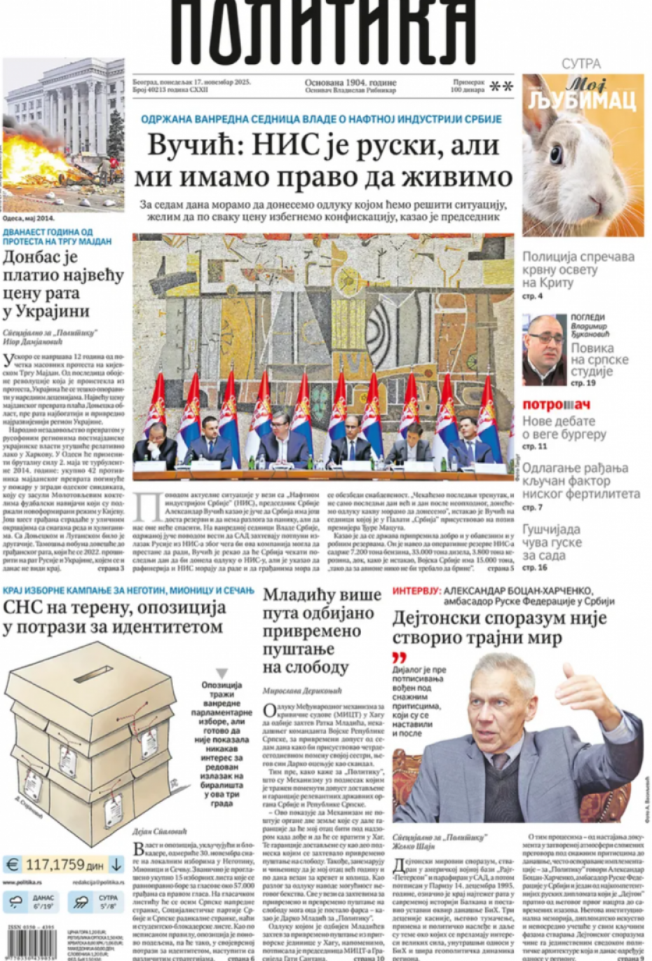 Pogledajte šta na naslovnim stranama donose dnevne novine u Srbiji u izdanju za ponedeljak, 17. novembar