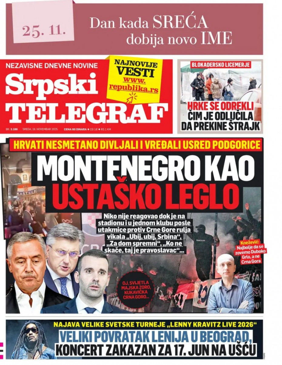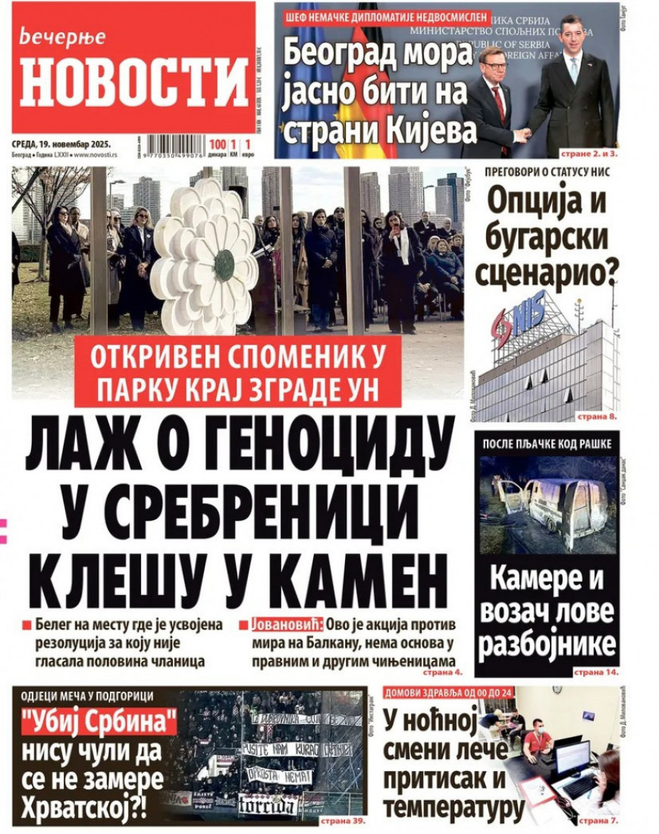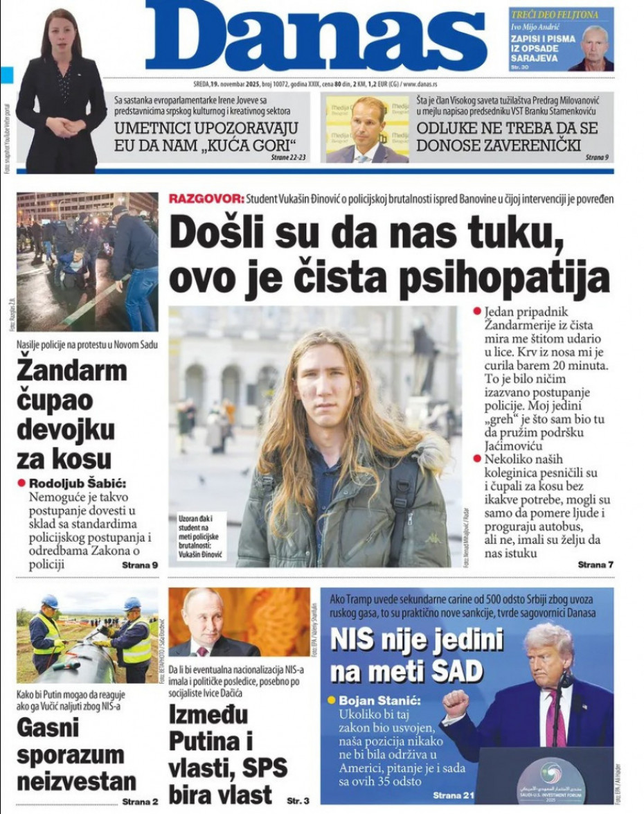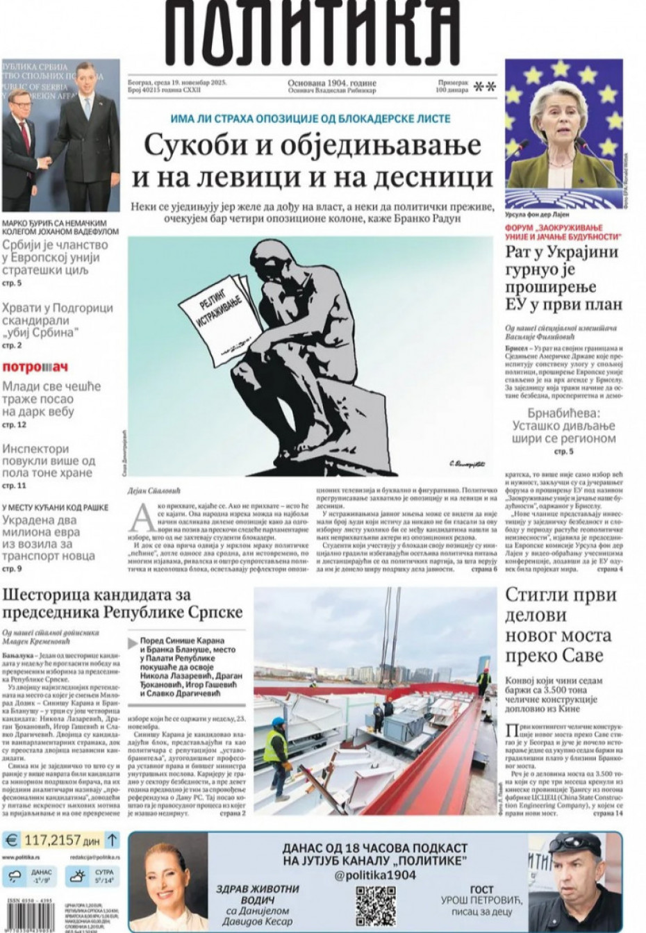 Naslovne strane dnevne štampe za sredu, 19. novembar