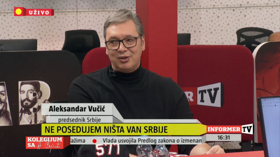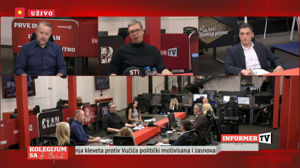 Predsednik Srbije Aleksandar Vučić bio je gost emisije "Kolegijum" na Informer televiziji gde je govorio o svim aktuelnim političkim i ekonomskim temama iz zemlje, ali i iz regiona i sveta. U fokusu je bila situacija sa Naftnom industrijom Srbije i sve teme vezane za prodaju ruskog dela NIS-a trećem licu.